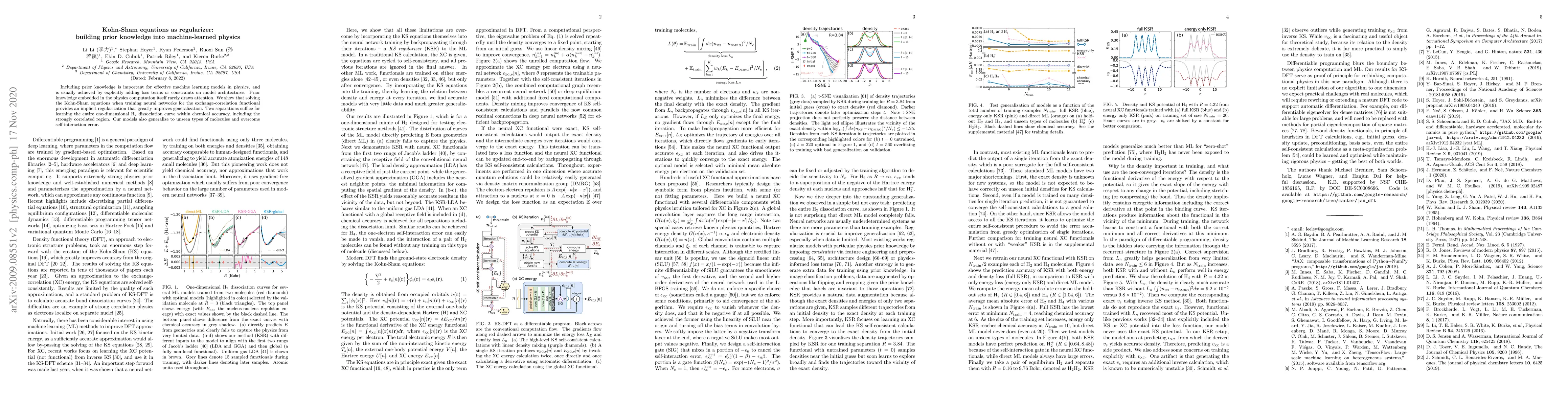 Including prior knowledge is important for effective machine learning models in physics, and is usually achieved by explicitly adding loss terms or constraints on model architectures. Prior knowledge embedded in the physics computation itself rarely draws attention. We show that solving the Kohn-Sham equations when training neural networks for the exchange-correlation functional provides an implicit regularization that greatly improves generalization. Two separations suffice for learning the entire one-dimensional H$_2$ dissociation curve within chemical accuracy, including the strongly correlated region. Our models also generalize to unseen types of molecules and overcome self-interaction error.