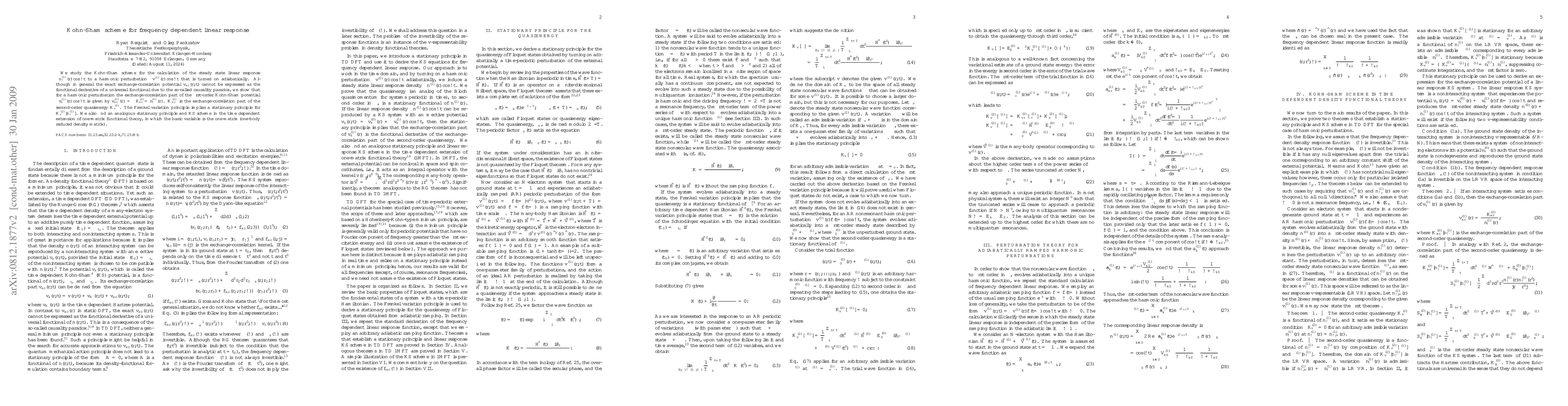 This paper explores the Kohn-Sham scheme for calculating linear response to harmonic perturbations, demonstrating that the exchange-correlation potential in this context can be expressed as the functional derivative of the second-order quasienergy. The study also extends the KS scheme to time-dependent one-matrix functional theory.