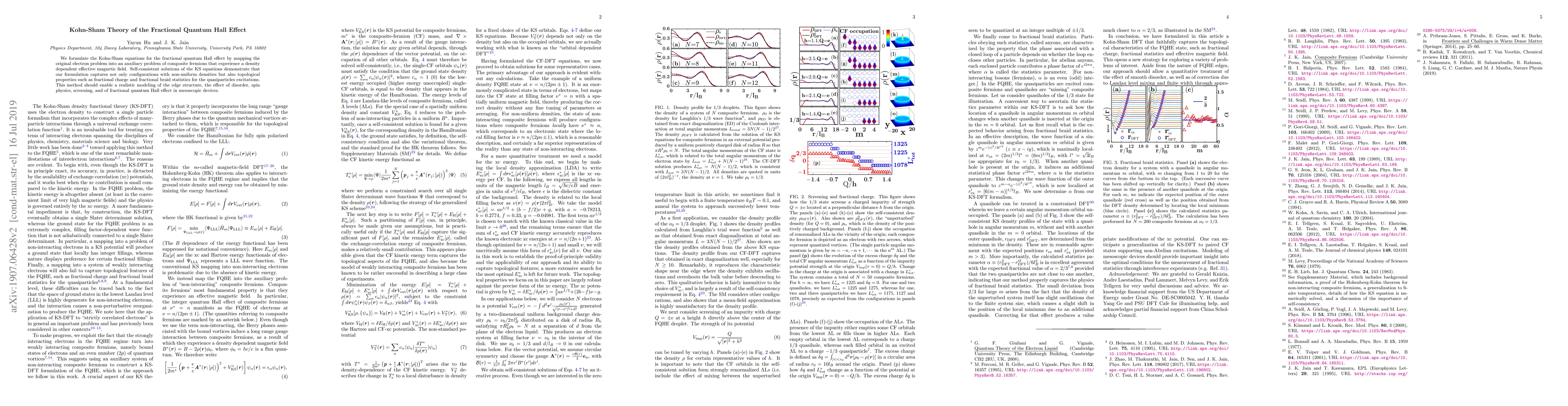 The paper formulates Kohn-Sham equations for the fractional quantum Hall effect by modeling electrons as composite fermions in an effective magnetic field. The self-consistent solutions reveal topological properties, including fractional charge and braid statistics, and enable modeling of various physical phenomena in mesoscopic devices.