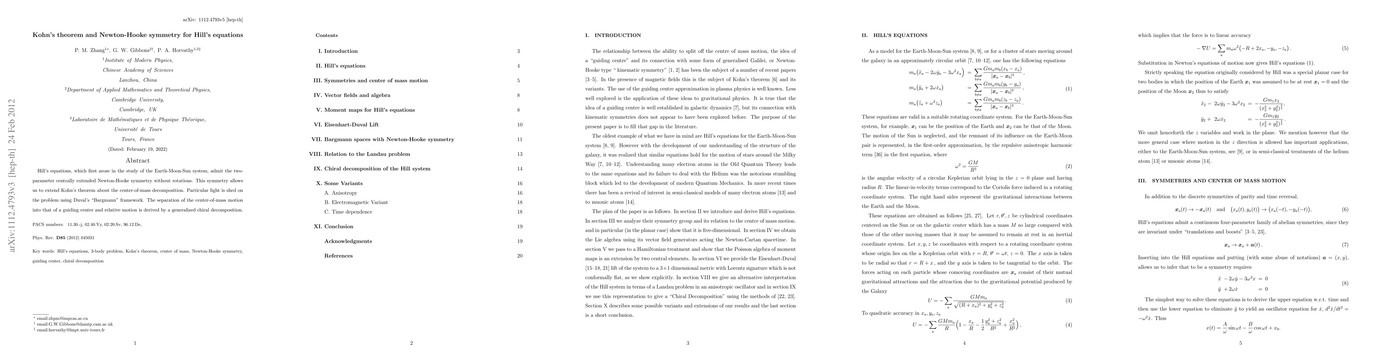 Hill's equations, which first arose in the study of the Earth-Moon-Sun system, admit the two-parameter centrally extended Newton-Hooke symmetry without rotations. This symmetry allows for extending Kohn's theorem about the center-of-mass decomposition. Particular light is shed on the problem using Duval's "Bargmann" framework. The separation of the center-of-mass motion into that of a guiding center and relative motion is derived by a generalized chiral decomposition.