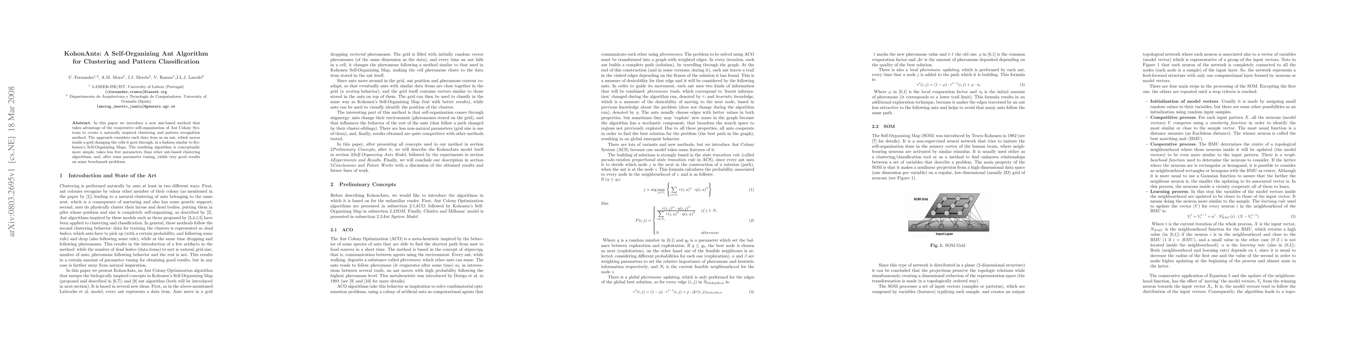 This paper presents KohonAnts, a novel ant-based clustering and pattern classification method inspired by self-organizing principles. It simplifies the process by treating each data item as an ant navigating a grid, similar to Kohonen's Self-Organizing Maps, achieving effective results with fewer parameters.