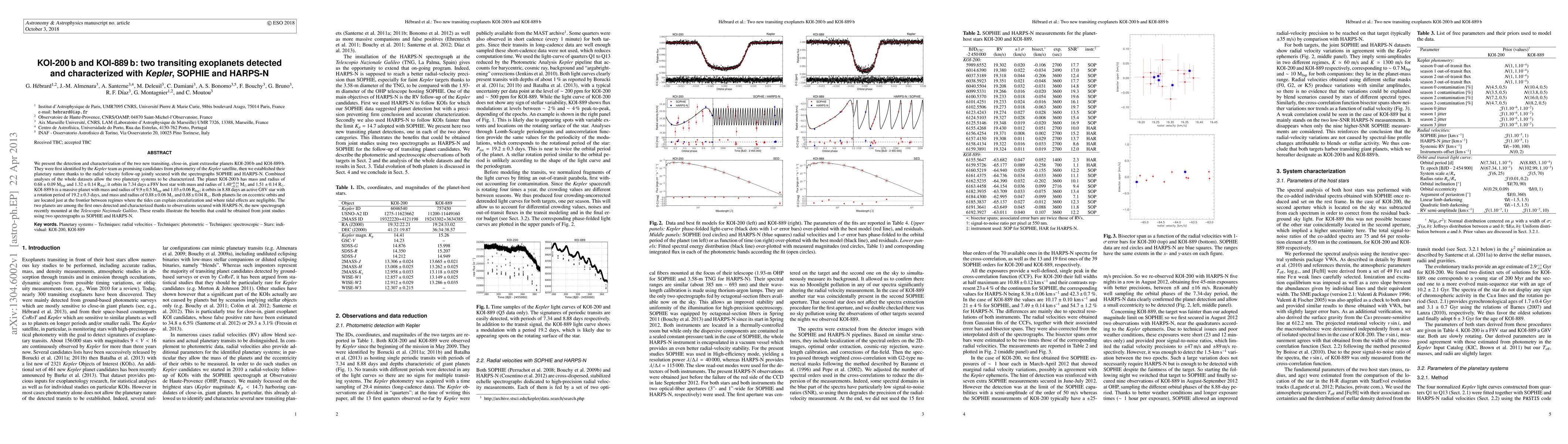 The paper detects and characterizes two transiting exoplanets, KOI-200b and KOI-889b, using a combination of Kepler photometry, SOPHIE and HARPS-N radial velocity measurements, revealing details about their masses, radii, orbits, and host star properties.