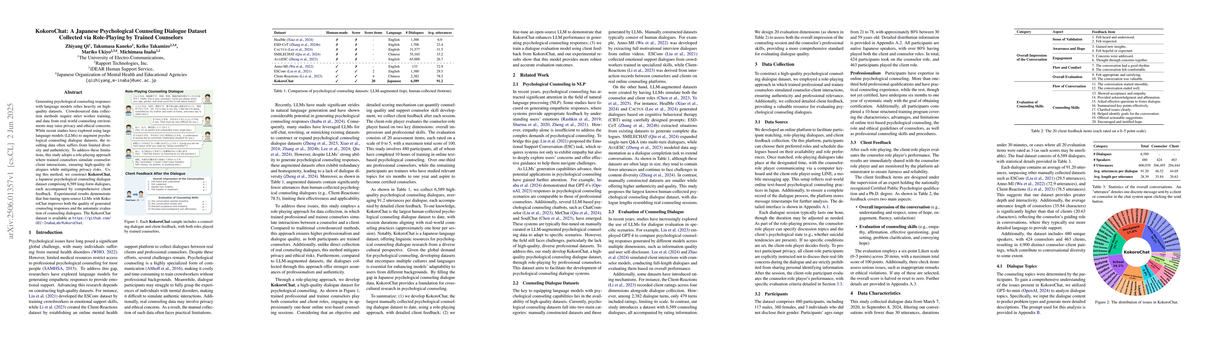 Researchers created KokoroChat, a high-quality Japanese psychological counseling dialogue dataset, using role-playing with trained counselors to address privacy concerns and improve diversity in AI-generated responses.
