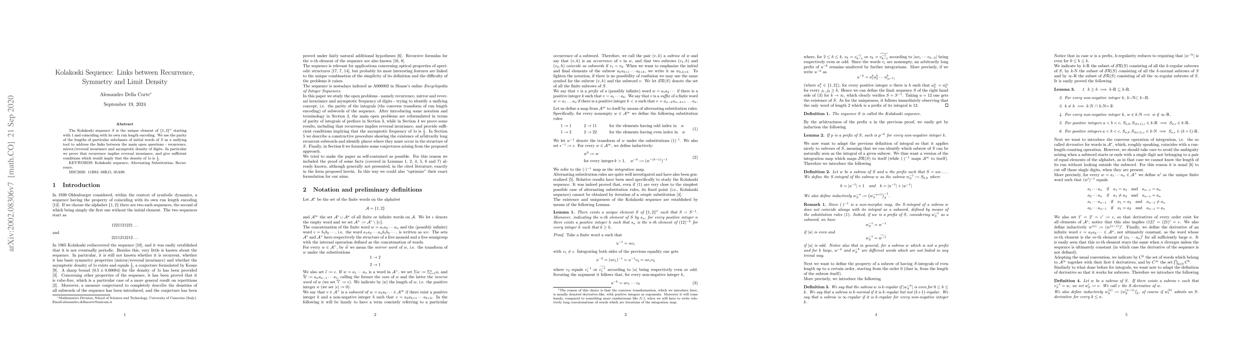 The Kolakoski sequence $S$ is the unique element of $\left\lbrace 1,2 \right\rbrace^{\omega}$ starting with 1 and coinciding with its own run length encoding. We use the parity of the lengths of particular subclasses of initial words of $S$ as a unifying tool to address the links between the main open questions - recurrence, mirror/reversal invariance and asymptotic density of digits. In particular we prove that recurrence implies reversal invariance, and give sufficient conditions which would imply that the density of 1s is $\frac{1}{2}$.