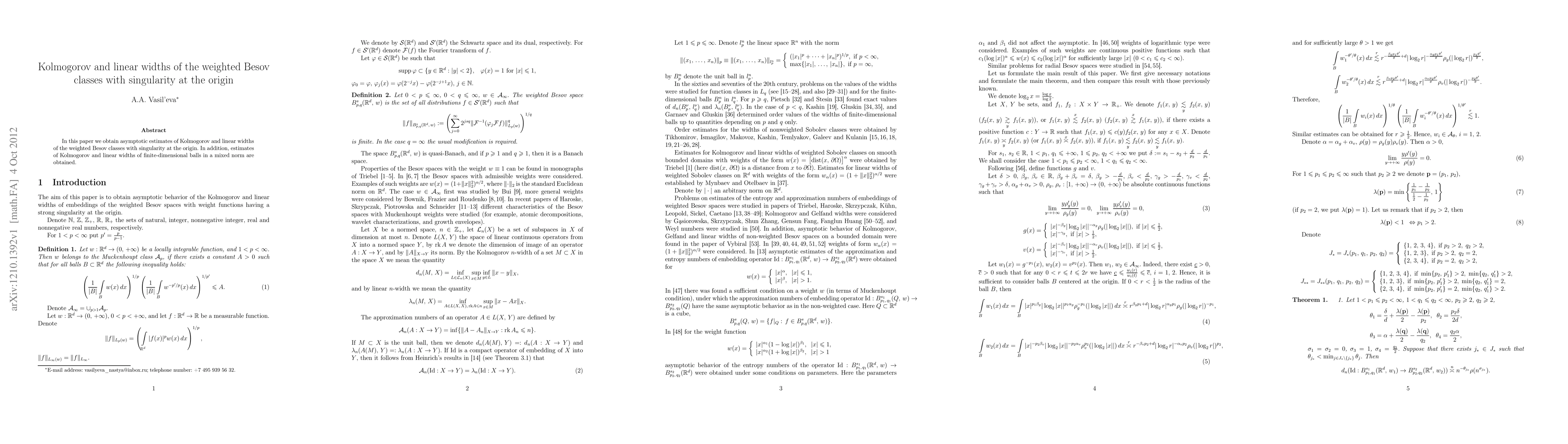 This paper provides asymptotic estimates for the Kolmogorov and linear widths of weighted Besov classes with a singularity at the origin, as well as finite-dimensional balls in a mixed norm.