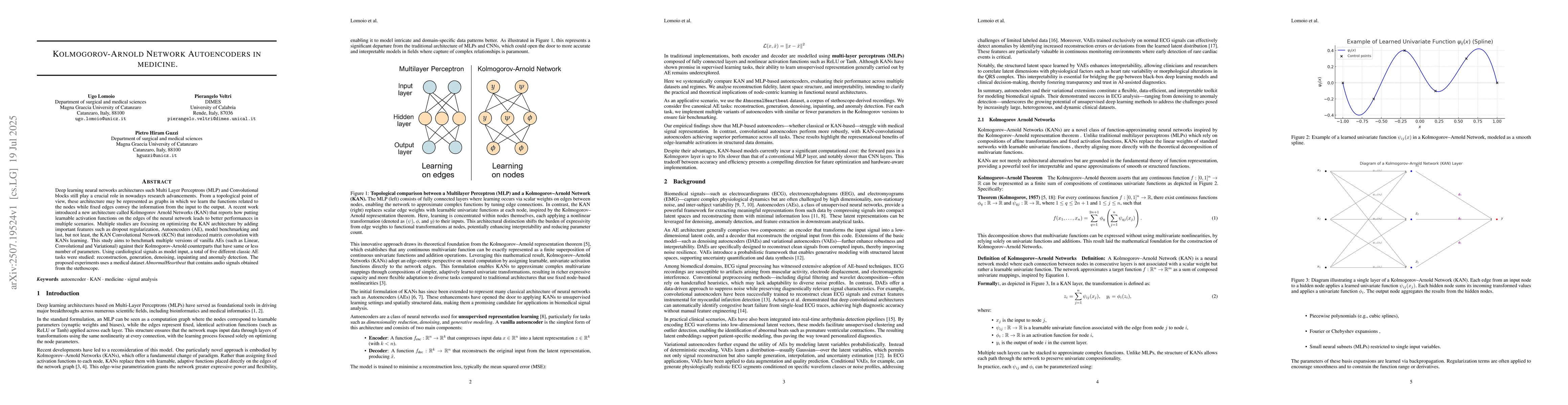 Deep learning neural networks architectures such Multi Layer Perceptrons (MLP) and Convolutional blocks still play a crucial role in nowadays research advancements. From a topological point of view, these architecture may be represented as graphs in which we learn the functions related to the nodes while fixed edges convey the information from the input to the output. A recent work introduced a new architecture called Kolmogorov Arnold Networks (KAN) that reports how putting learnable activation functions on the edges of the neural network leads to better performances in multiple scenarios. Multiple studies are focusing on optimizing the KAN architecture by adding important features such as dropout regularization, Autoencoders (AE), model benchmarking and last, but not least, the KAN Convolutional Network (KCN) that introduced matrix convolution with KANs learning. This study aims to benchmark multiple versions of vanilla AEs (such as Linear, Convolutional and Variational) against their Kolmogorov-Arnold counterparts that have same or less number of parameters. Using cardiological signals as model input, a total of five different classic AE tasks were studied: reconstruction, generation, denoising, inpainting and anomaly detection. The proposed experiments uses a medical dataset \textit{AbnormalHeartbeat} that contains audio signals obtained from the stethoscope.