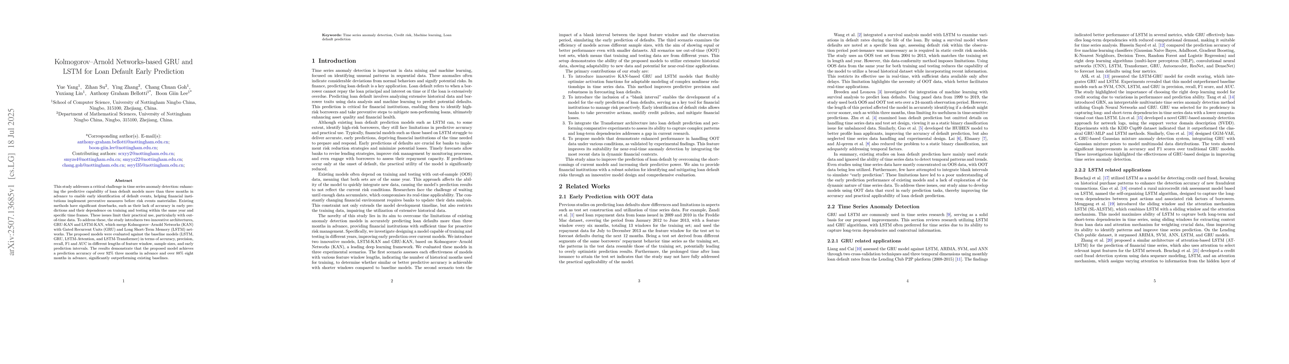 This work stands out by applying LSTM-Transformer as a baseline to predict loan defaults, demonstrating that KAN-based models outperform traditional methods in various metrics, particularly in early prediction conditions.