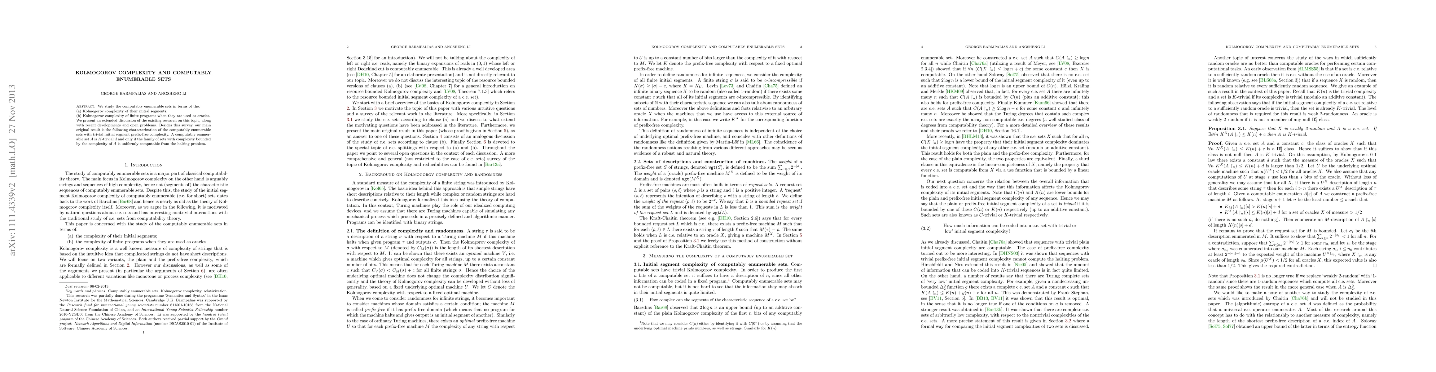 This paper surveys the relationship between computably enumerable sets and Kolmogorov complexity, highlighting recent developments and open questions. The key result characterizes $K$-trivial computably enumerable sets as those whose complexity bounds are uniformly computable from the halting problem.