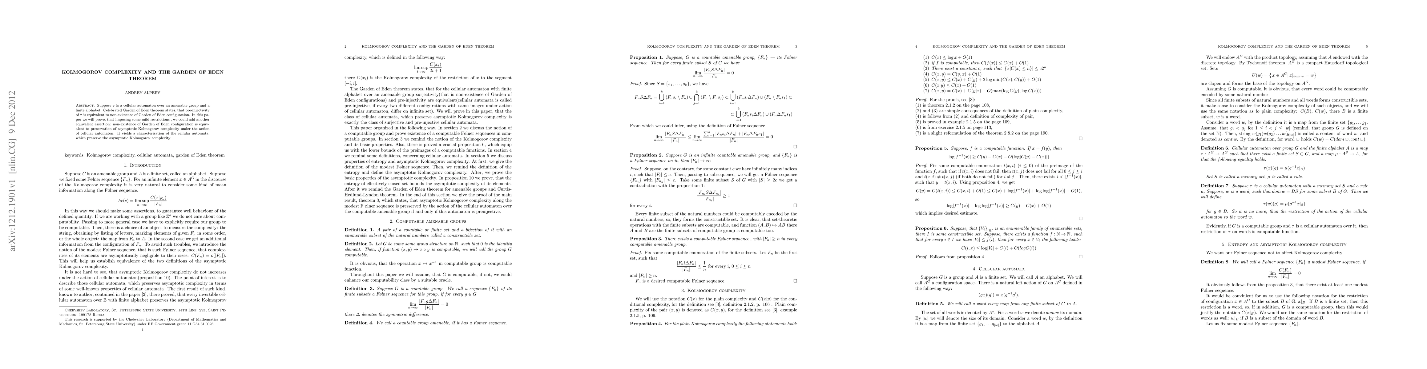 Suppose $\tau$ is a cellular automaton over an amenable group and a finite alphabet. Celebrated Garden of Eden theorem states, that pre-injectivity of $\tau$ is equivalent to non-existence of Garden of Eden configuration. In this paper we will prove, that imposing some mild restrictions, we could add another equivalent assertion: non-existence of Garden of Eden configuration is equivalent to preservation of asymptotic Kolmogorov complexity under the action of cellular automaton. It yields a characterisation of the cellular automata, which preserve the asymptotic Kolmogorov complexity.