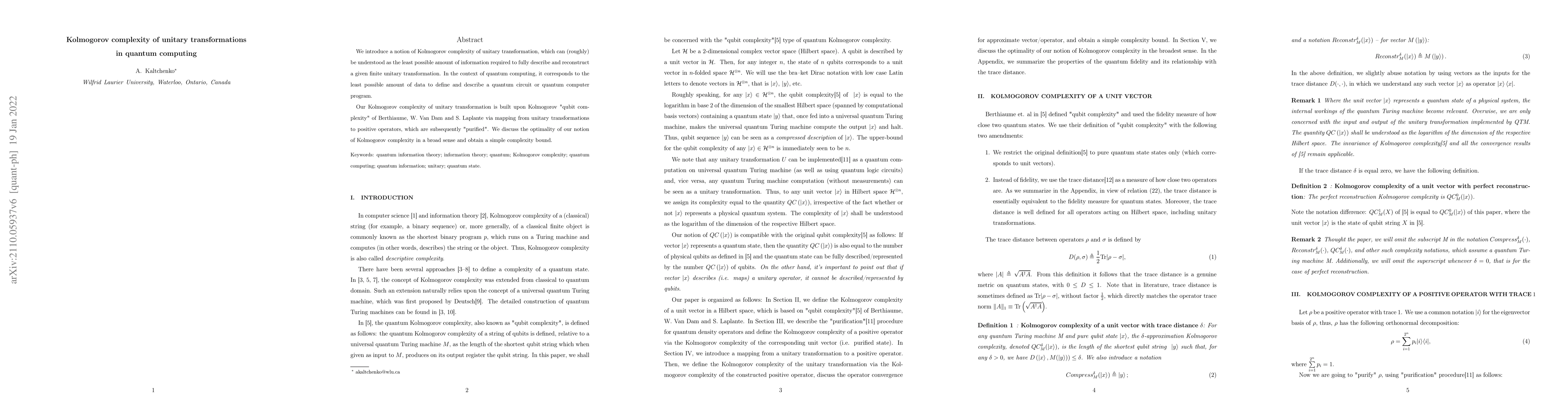 The paper presents a novel definition of Kolmogorov complexity for unitary transformations in quantum computing, utilizing purification and trace distance, along with a simple complexity bound for approximate reconstruction.