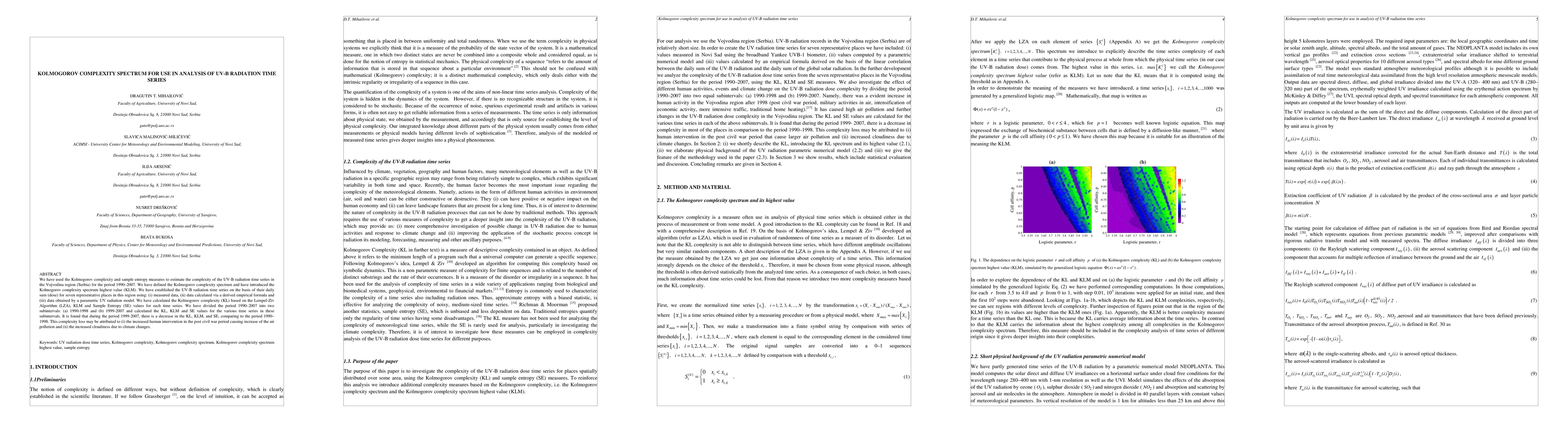 This study uses Kolmogorov complexity and sample entropy to analyze the complexity of UV-B radiation time series in Vojvodina, Serbia, from 1990-2007. It finds a decrease in complexity from 1999-2007 compared to 1990-1998, potentially due to increased air pollution and cloudiness.
