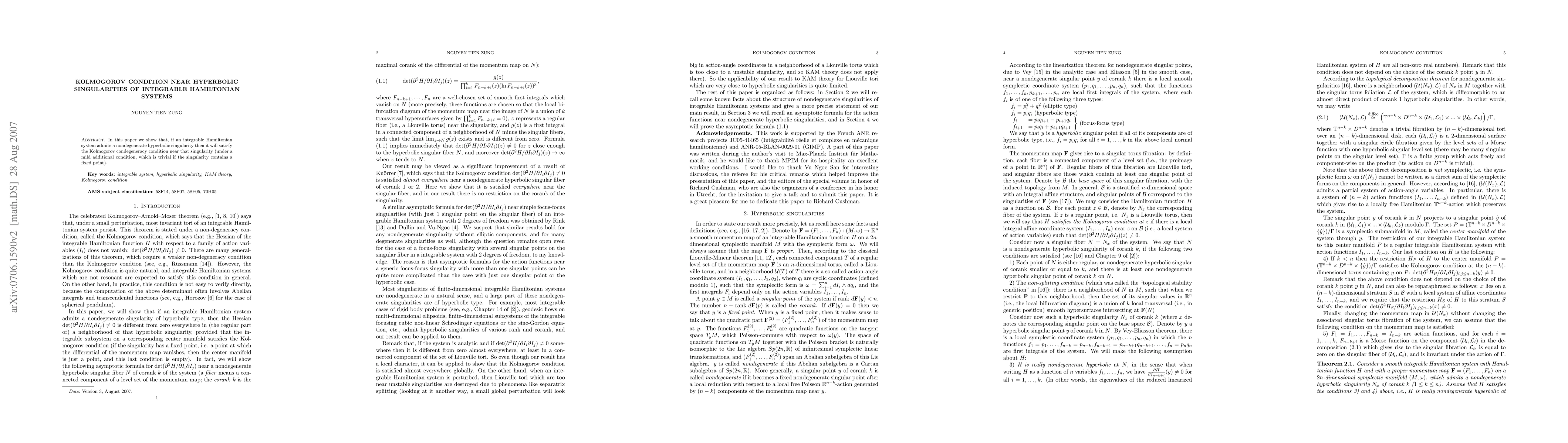 A study on Hamiltonian systems finds that nondegenerate hyperbolic singularities lead to the Kolmogorov condition being satisfied near the singularity, under a mild additional condition.