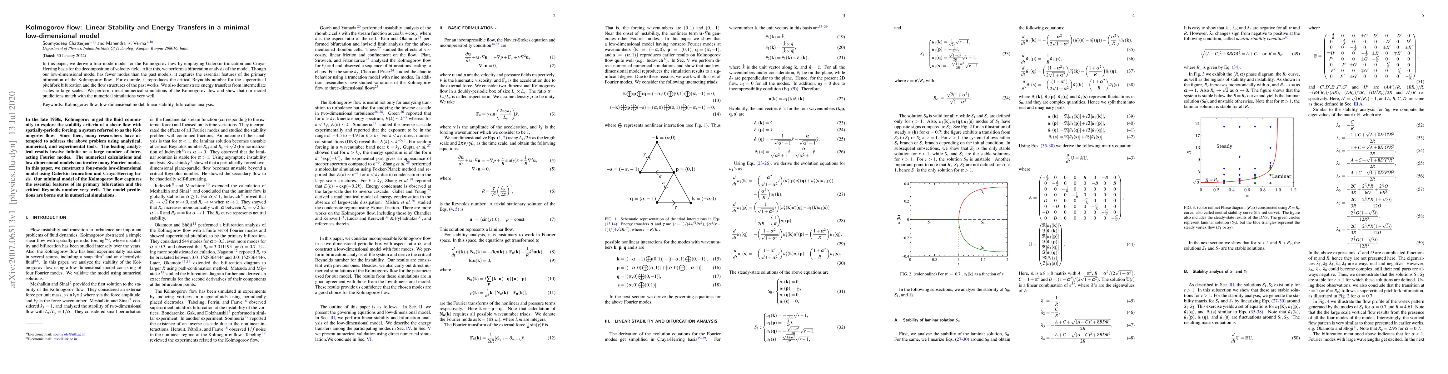 In this paper, we derive a four-mode model for the Kolmogorov flow by employing Galerkin truncation and Craya-Herring basis for the decomposition of velocity field. After this, we perform a bifurcation analysis of the model. Though our low-dimensional model has fewer modes than the past models, it captures the essential features of the primary bifurcation of the Kolmogorov flow. For example, it reproduces the critical Reynolds number for the supercritical pitchfork bifurcation and the flow structures of the past works. We also demonstrate energy transfers from intermediate scales to large scales. We perform direct numerical simulations of the Kolmogorov flow and show that our model predictions match with the numerical simulations very well.