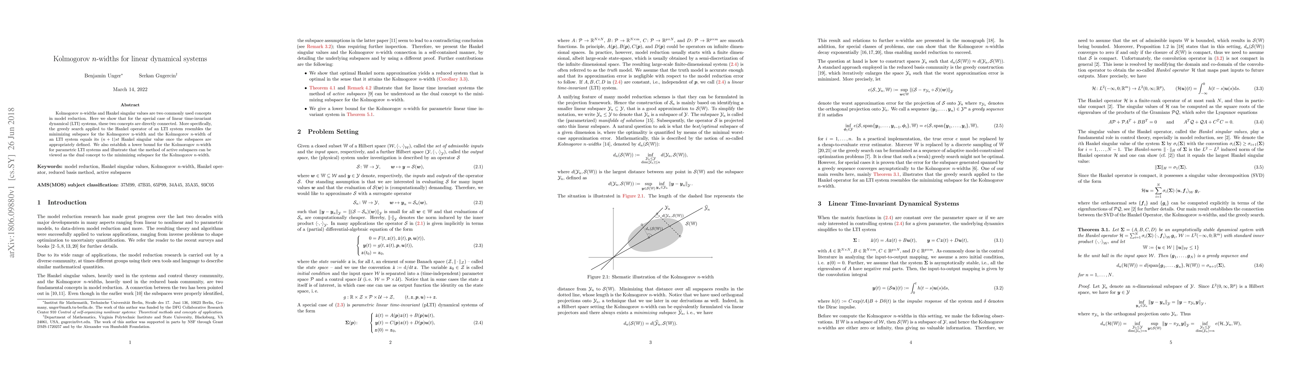 Researchers discovered a direct connection between two model reduction concepts, Kolmogorov n-widths and Hankel singular values, in linear time-invariant systems, showing that the greedy search for one concept resembles the minimizing subspace of the other and establishes a key relationship between them.