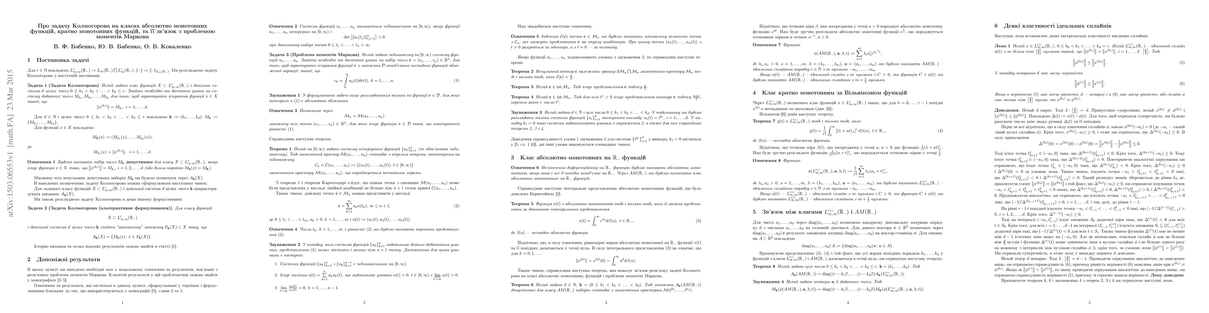 In this paper we solve Kolmogorov problem about existence of a function with given norms of derivatives for classes of multiple monotone functions and absolute monotone functions in the case of arbitrary number of norms. We also show the connection of Kolmogorov problem with Markov moment problem.