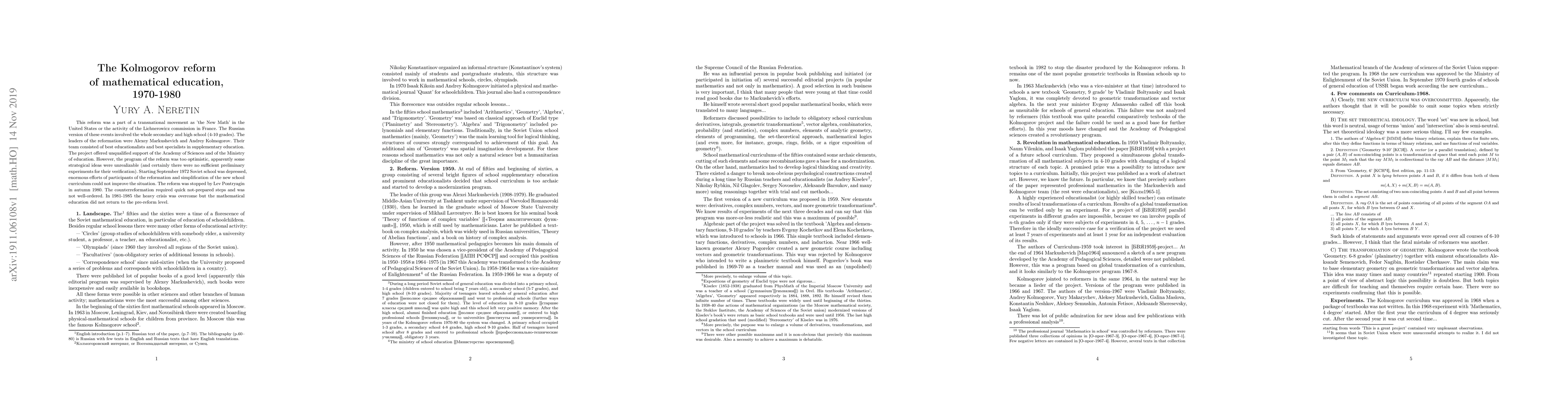 This reform was a part of a transnational movement as 'the New Math' in the United States or the activity of the Lichnerowicz commission in France. The Russian version of these events involved the whole secondary and high school (4-10 grades). The leaders of the reformation were Alexey Markushevich and Andrey Kolmogorov. Their team consisted of best educationalists and best specialists in supplementary education. The project offered unqualified support of the Academy of Sciences and of the Ministry of education. However, the program of the reform was too optimistic, apparently some strategical ideas were unrealizable (and certainly there were no sufficient preliminary experiments for their verification). Starting September 1972 Soviet school was depressed, enormous efforts of participants of the reformation and simplification of the new school curriculum could not improve the situation. The reform was stopped by Lev Pontryagin in autumn 1980. The counterreformation required quick not-prepared steps and was not well-ordered. In 1981-1985 the heavy crisis was overcome but the mathematical education did not return to the pre-reform level.