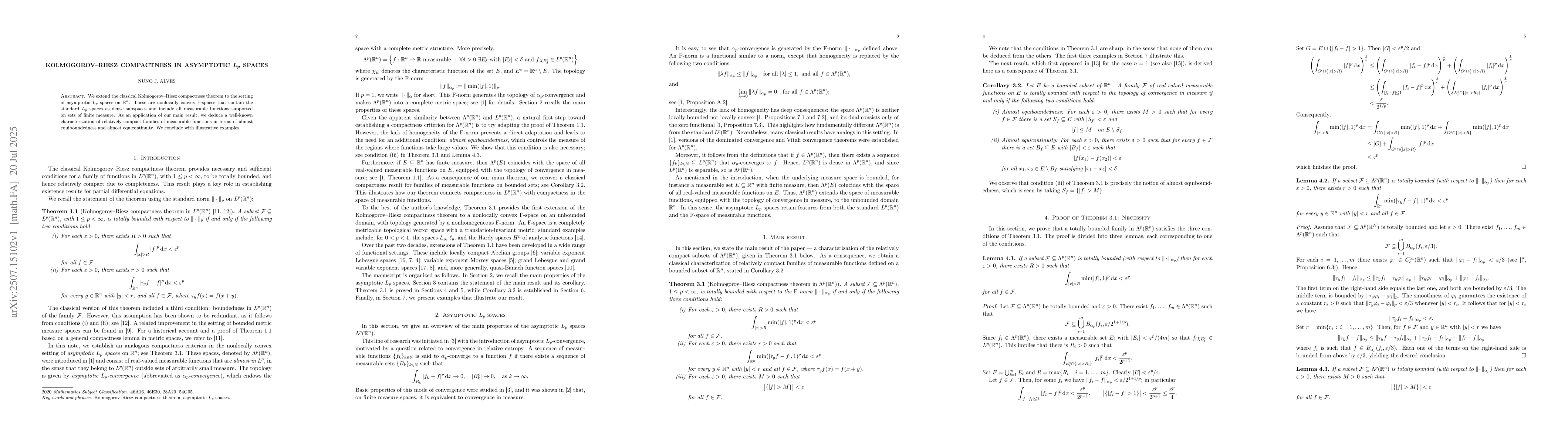 We extend the classical Kolmogorov-Riesz compactness theorem to the setting of asymptotic $L_p$ spaces on $\mathbb{R}^n$. These are nonlocally convex $\mathrm{F}$-spaces that contain the standard $L_p$ spaces as dense subspaces and include all measurable functions supported on sets of finite measure. As an application of our main result, we deduce a well-known characterization of relatively compact families of measurable functions in terms of almost equiboundedness and almost equicontinuity. We conclude with illustrative examples.