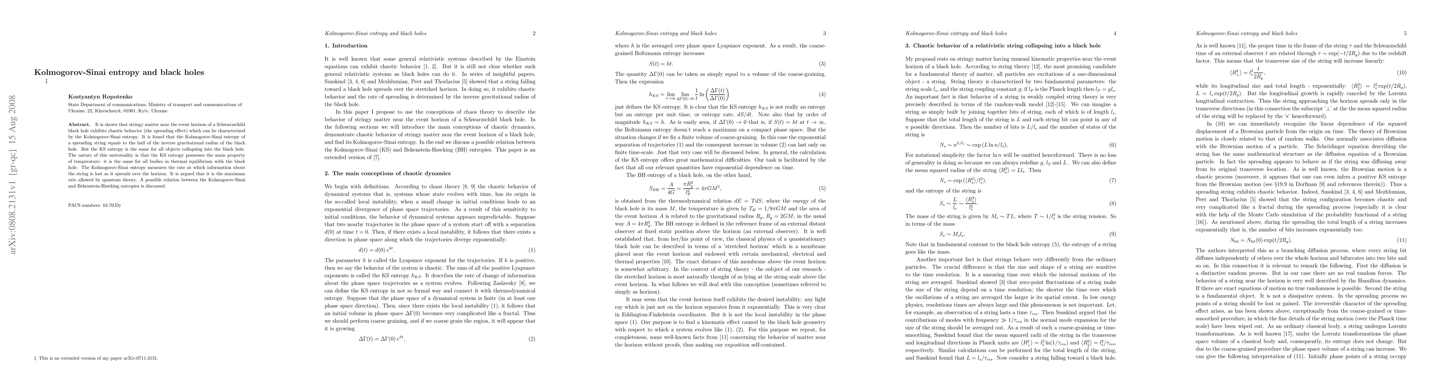 The paper demonstrates that stringy matter near a Schwarzschild black hole's event horizon shows chaotic behavior characterized by Kolmogorov-Sinai entropy, which equals half the inverse gravitational radius of the black hole. It argues that this entropy universality mirrors the property of temperature, suggesting a connection between the Kolmogorov-Sinai and Bekenstein-Hawking entropies.