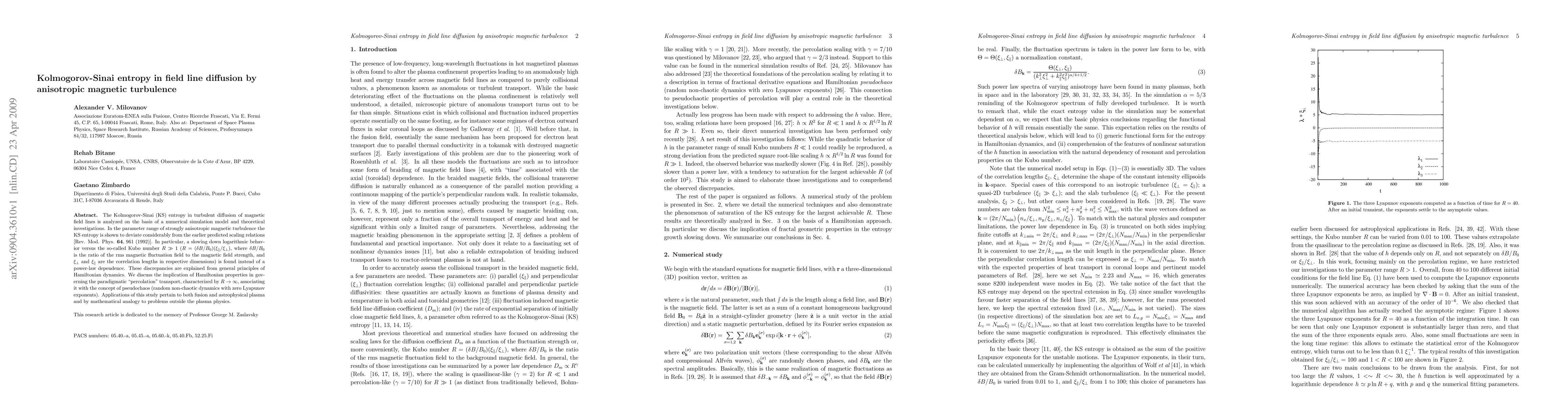 The Kolmogorov-Sinai (KS) entropy in turbulent diffusion of magnetic field lines is analyzed on the basis of a numerical simulation model and theoretical investigations. In the parameter range of strongly anisotropic magnetic turbulence the KS entropy is shown to deviate considerably from the earlier predicted scaling relations [Rev. Mod. Phys. {\bf 64}, 961 (1992)]. In particular, a slowing down logarithmic behavior versus the so-called Kubo number $R\gg 1$ ($R = (\delta B / B_0) (\xi_\| / \xi_\bot)$, where $\delta B / B_0$ is the ratio of the rms magnetic fluctuation field to the magnetic field strength, and $\xi_\bot$ and $\xi_\|$ are the correlation lengths in respective dimensions) is found instead of a power-law dependence. These discrepancies are explained from general principles of Hamiltonian dynamics. We discuss the implication of Hamiltonian properties in governing the paradigmatic "percolation" transport, characterized by $R\to\infty$, associating it with the concept of pseudochaos (random non-chaotic dynamics with zero Lyapunov exponents). Applications of this study pertain to both fusion and astrophysical plasma and by mathematical analogy to problems outside the plasma physics. This research article is dedicated to the memory of Professor George M. Zaslavsky