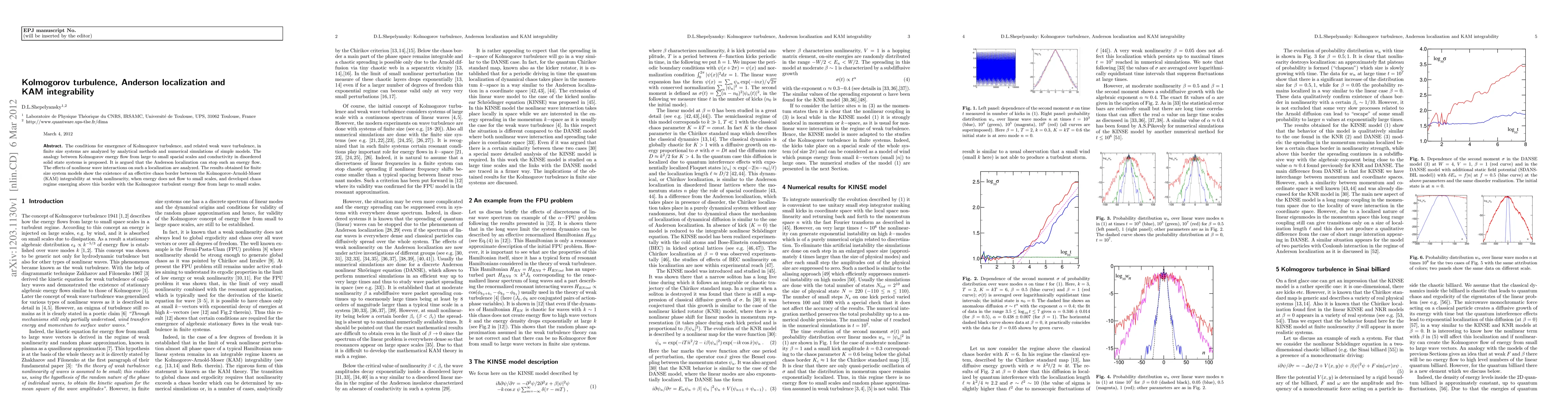 This paper investigates the conditions for Kolmogorov turbulence emergence in finite-size systems through analytical and numerical methods, proposing an analogy between energy flow in turbulence and conductivity in disordered solids. It argues that Anderson localization can halt this energy flow and explores the impact of nonlinear wave interactions on localization, revealing a chaos border between KAM integrability and developed chaos with turbulent energy flow.