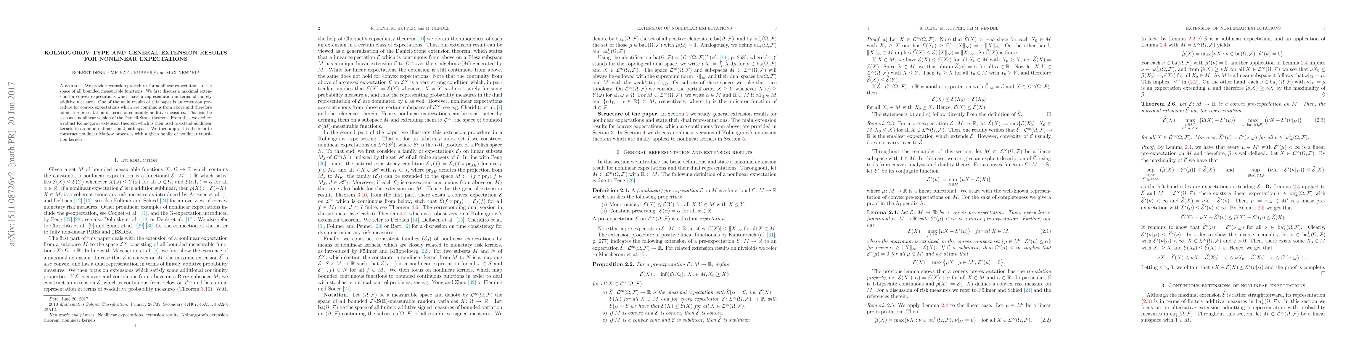 We provide extension procedures for nonlinear expectations to the space of all bounded measurable functions. We first discuss a maximal extension for convex expectations which have a representation in terms of finitely additive measures. One of the main results of this paper is an extension procedure for convex expectations which are continuous from above and therefore admit a representation in terms of countably additive measures. This can be seen as a nonlinear version of the Daniell-Stone theorem. From this, we deduce a robust Kolmogorov extension theorem which is then used to extend nonlinear kernels to an infinite dimensional path space. We then apply this theorem to construct nonlinear Markov processes with a given family of nonlinear transition kernels.
