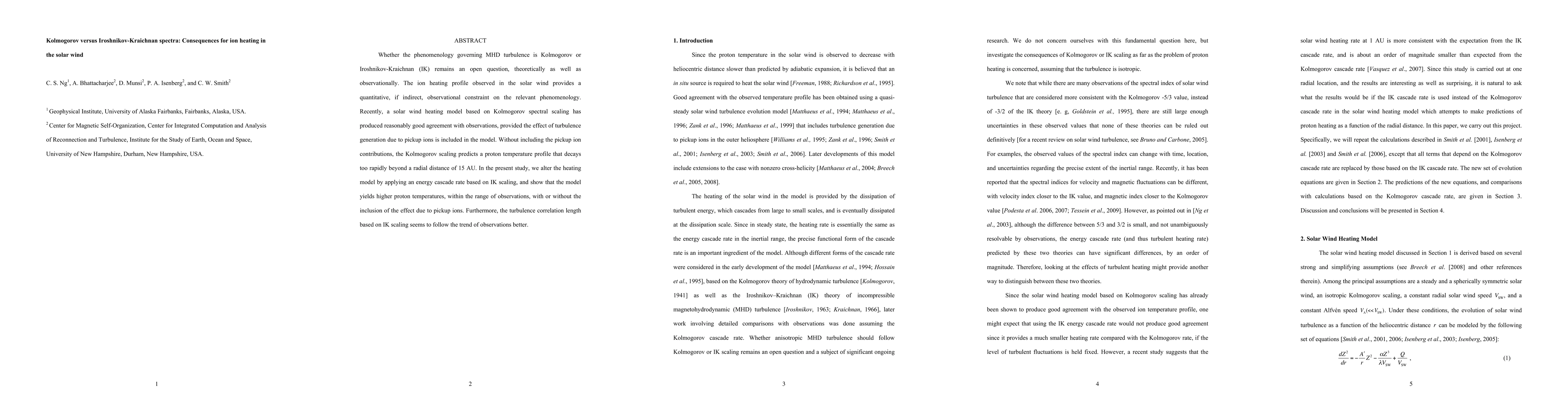 This paper compares the consequences of Kolmogorov versus Iroshnikov-Kraichnan spectra on ion heating in the solar wind, finding that an IK-based model predicts higher proton temperatures and better aligns with observational data, especially when considering turbulence from pickup ions.