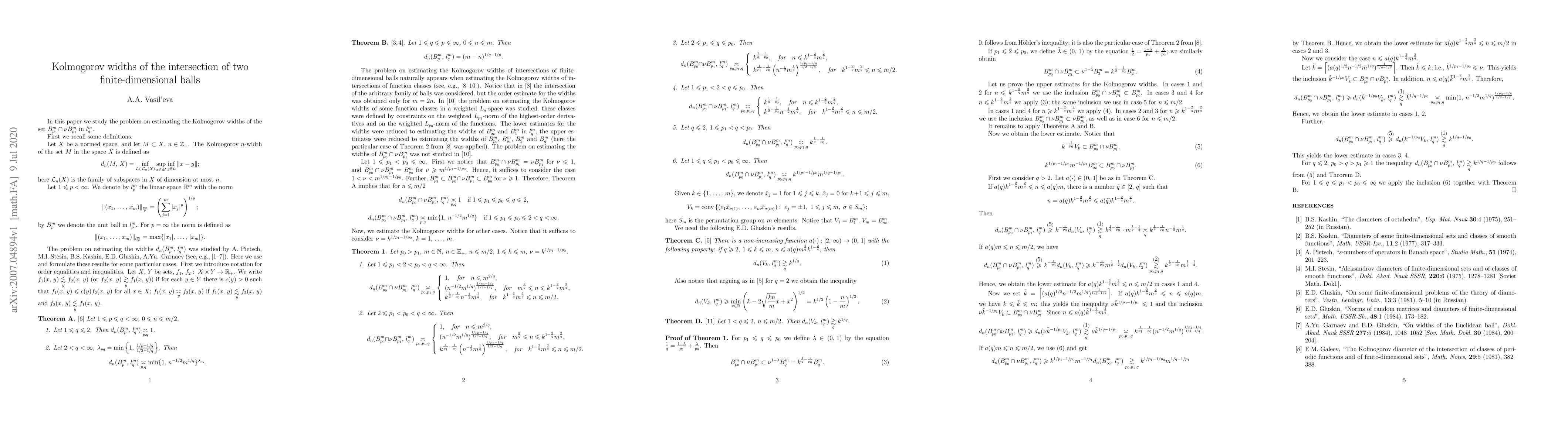 This paper provides order estimates for the Kolmogorov widths of the intersection of two finite-dimensional balls in $l_q^m$ spaces, considering the conditions $0\le n\le m/2$, $p_0>p_1$, and $q<\infty$. The results offer insights into the geometric properties of these intersections.