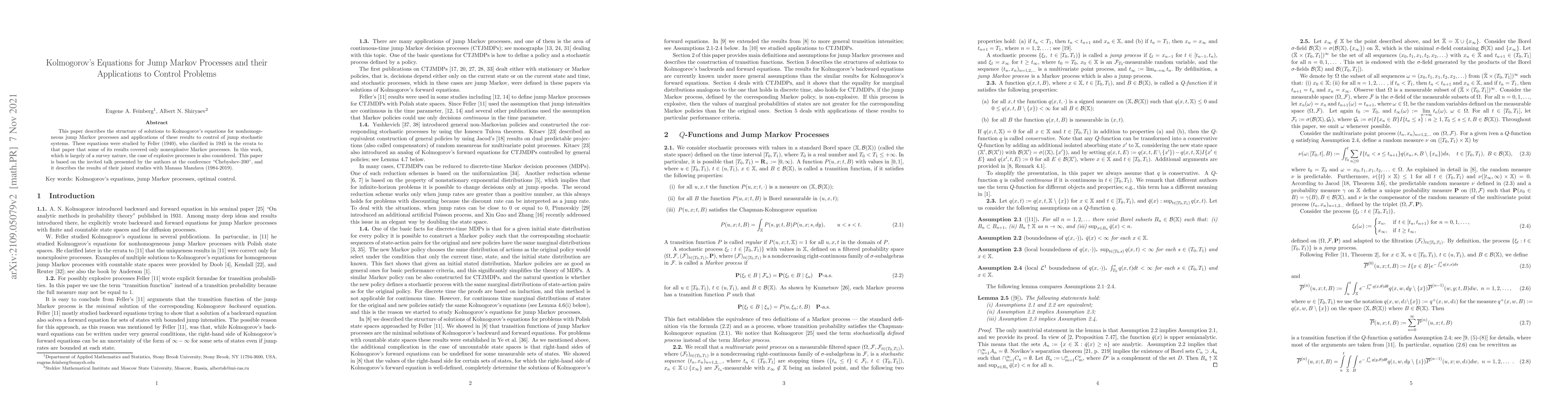 This paper describes the structure of solutions to Kolmogorov's equations for nonhomogeneous jump Markov processes and applications of these results to control of jump stochastic systems. These equations were studied by Feller (1940), who clarified in 1945 in the errata to that paper that some of its results covered only nonexplosive Markov processes. In this work, which is largely of a survey nature, the case of explosive processes is also considered. This paper is based on the invited talk presented by the authors at the conference "Chebyshev-200", and it describes the results of their joined studies with Manasa Mandava (1984-2019).