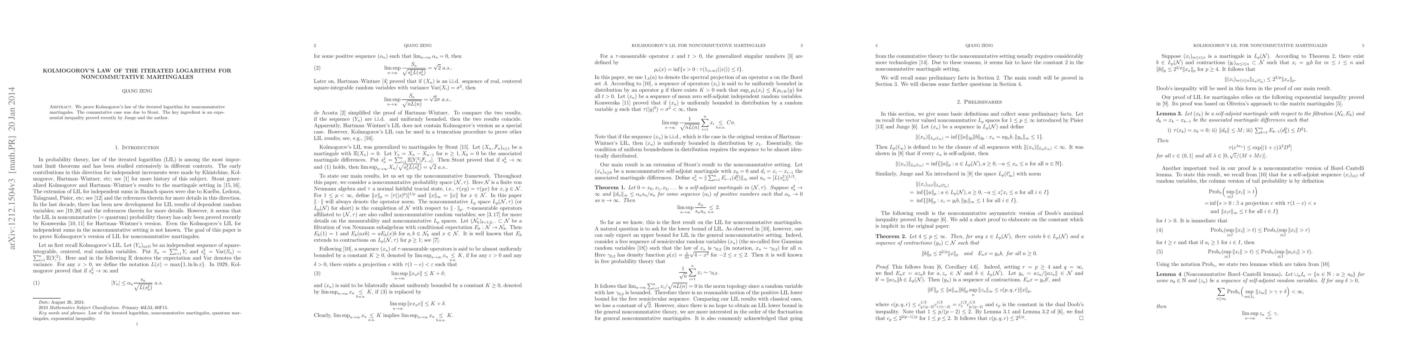 Summary: This paper proves Kolmogorov's law of the iterated logarithm for noncommutative martingales, extending Stout's commutative result. The proof leverages an exponential inequality developed by Junge and the author.