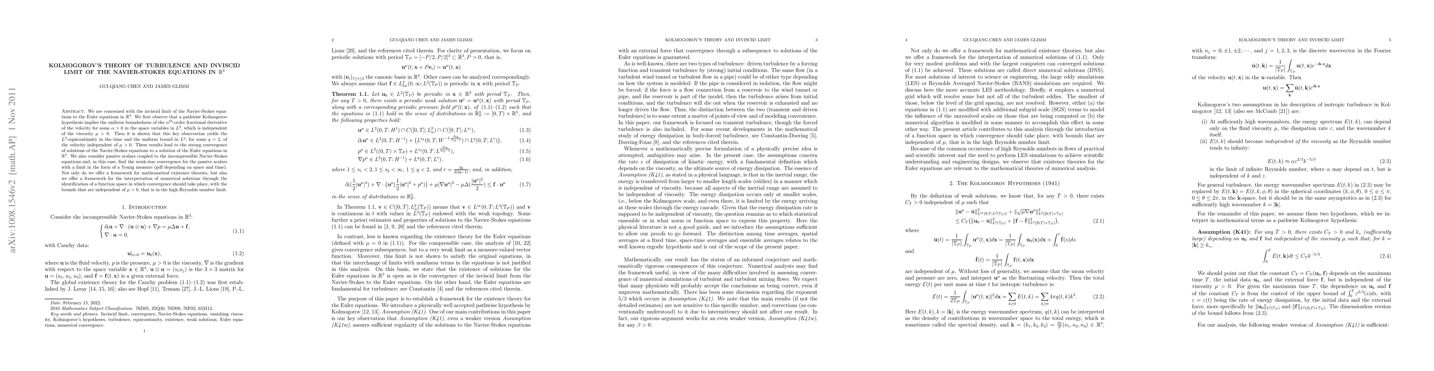We are concerned with the inviscid limit of the Navier-Stokes equations to the Euler equations in $\R^3$. We first observe that a pathwise Kolmogorov hypothesis implies the uniform boundedness of the $\alpha^{th}$-order fractional derivative of the velocity for some $\alpha>0$ in the space variables in $L^2$, which is independent of the viscosity $\mu>0$. Then it is shown that this key observation yields the $L^2$-equicontinuity in the time and the uniform bound in $L^q$, for some $q>2$, of the velocity independent of $\mu>0$. These results lead to the strong convergence of solutions of the Navier-Stokes equations to a solution of the Euler equations in $\R^3$. We also consider passive scalars coupled to the incompressible Navier-Stokes equations and, in this case, find the weak-star convergence for the passive scalars with a limit in the form of a Young measure (pdf depending on space and time). Not only do we offer a framework for mathematical existence theories, but also we offer a framework for the interpretation of numerical solutions through the identification of a function space in which convergence should take place, with the bounds that are independent of $\mu>0$, that is in the high Reynolds number limit.