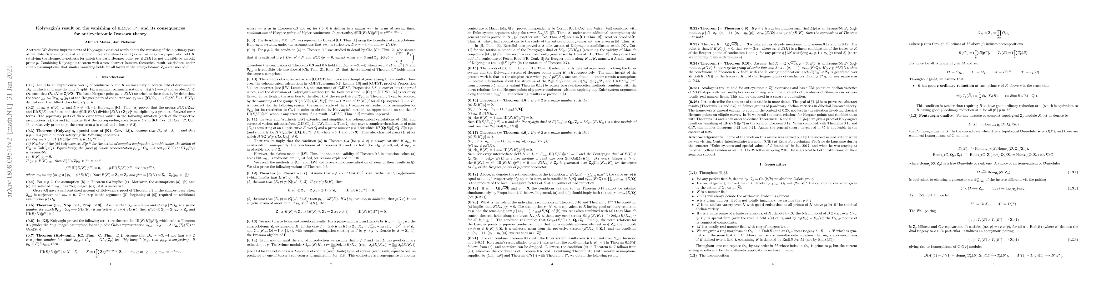 Let $E$ be an elliptic curve defined over ${\bf Q}$ and $K$ an imaginary quadratic field satisfying the Heegner hypothesis. A classical result of Kolyvagin states that, under suitable assumptions, if the basic Heegner point $y_K \in E(K)$ is not divisible by an odd prime $p$, then the groups $E(K)/{\bf Z} y_K$ and $\sha(E/K)$ are finite and their orders are prime to $p$. In this article we develop the following themes: firstly, we discuss improvements of Kolyvagin's result, following Cha (2005) and Lawson and Wuthrich (2016). Secondly, we prove an abstract Iwasawa-theoretical result which allows us to deduce, under several additional assumptions, that similar vanishing holds for all layers in the anticyclotomic ${\bf Z}_p$-extension of $K$. Analogous results hold for CM points on simple quotients of Jacobians of Shimura curves over totally real fields; this will be discussed in a separate article.