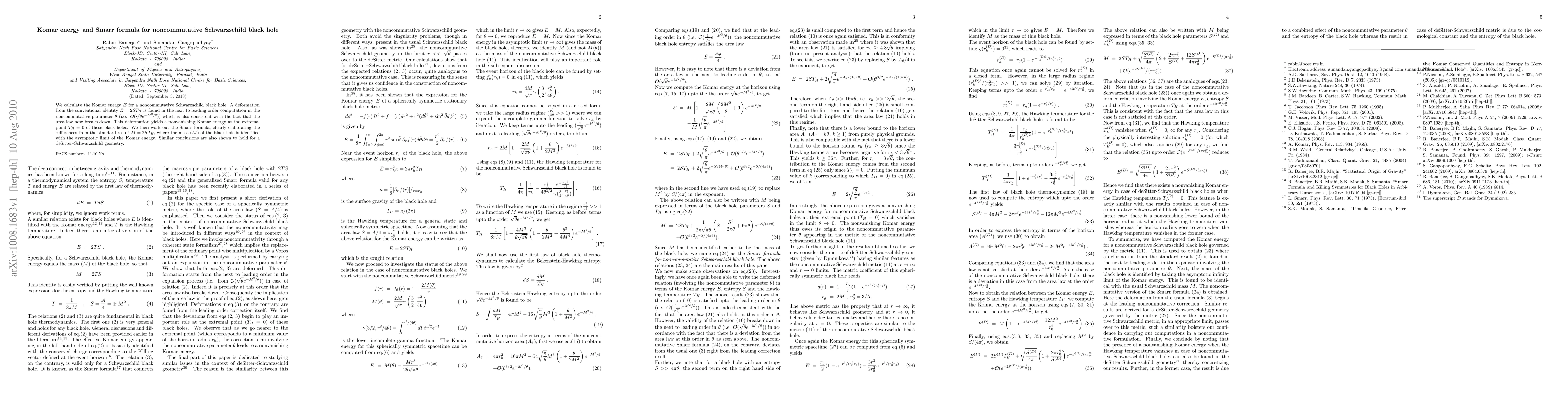 This paper calculates the Komar energy for noncommutative Schwarzschild black holes, revealing a deformation in the conventional energy-entropy relationship and yielding a nonvanishing Komar energy at extremal conditions. It also elaborates on the Smarr formula, showing significant differences from the standard mass-entropy-temperature relation, with similar findings for deSitter-Schwarzschild geometry.