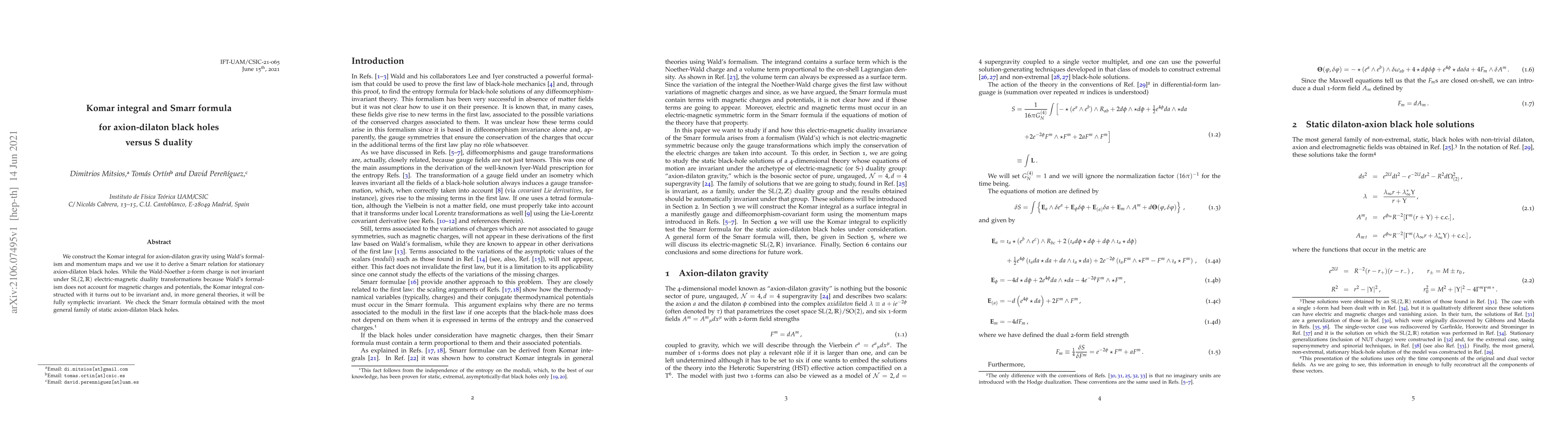 This paper constructs the Komar integral for axion-dilaton black holes using Wald's formalism and shows it leads to a Smarr relation. Despite the Wald-Noether charge lacking invariance under duality transformations, the derived Smarr formula remains invariant and applicable to a broader range of theories.