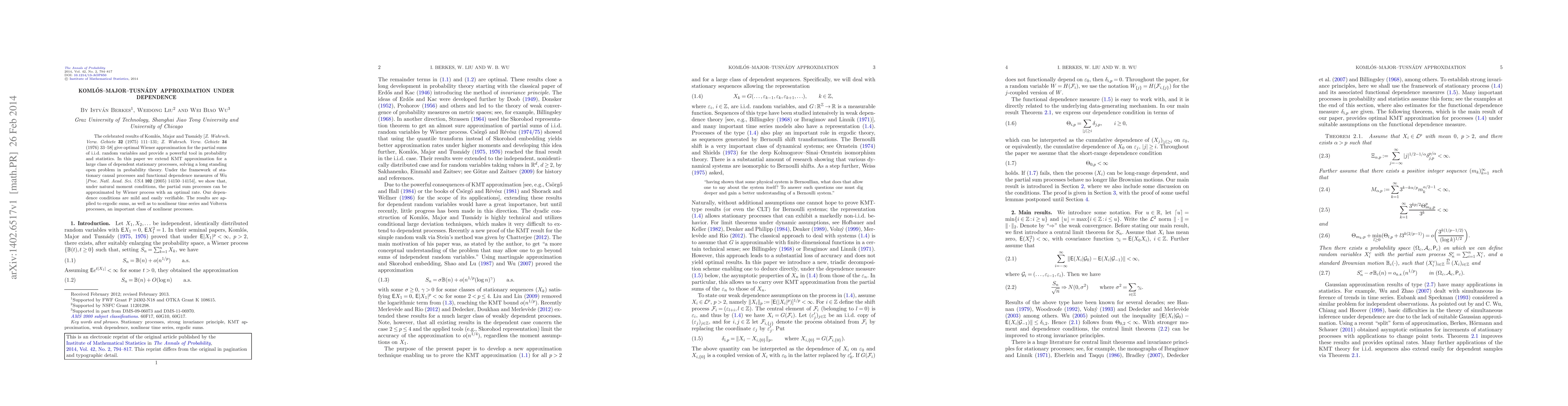 This paper extends the Komlös-Major-Tusnēdy approximation to a large class of dependent stationary processes, solving a long-standing open problem in probability theory. It shows that partial sum processes can be approximated by Wiener process with an optimal rate under mild dependence conditions.