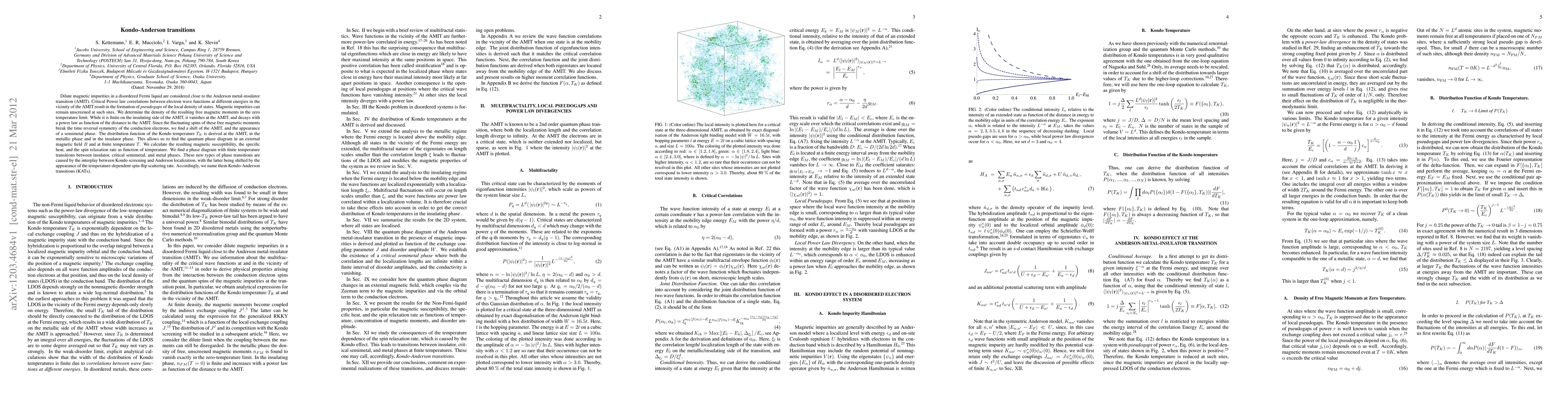 This paper investigates the Kondo-Anderson transitions near the Anderson metal-insulator transition, revealing critical power law correlations leading to pseudogaps and unscreened magnetic moments. It derives the quantum phase diagram, magnetic susceptibility, and specific heat, identifying new phase transitions between insulator, semimetal, and metal phases driven by the interplay of Kondo screening and Anderson localization.