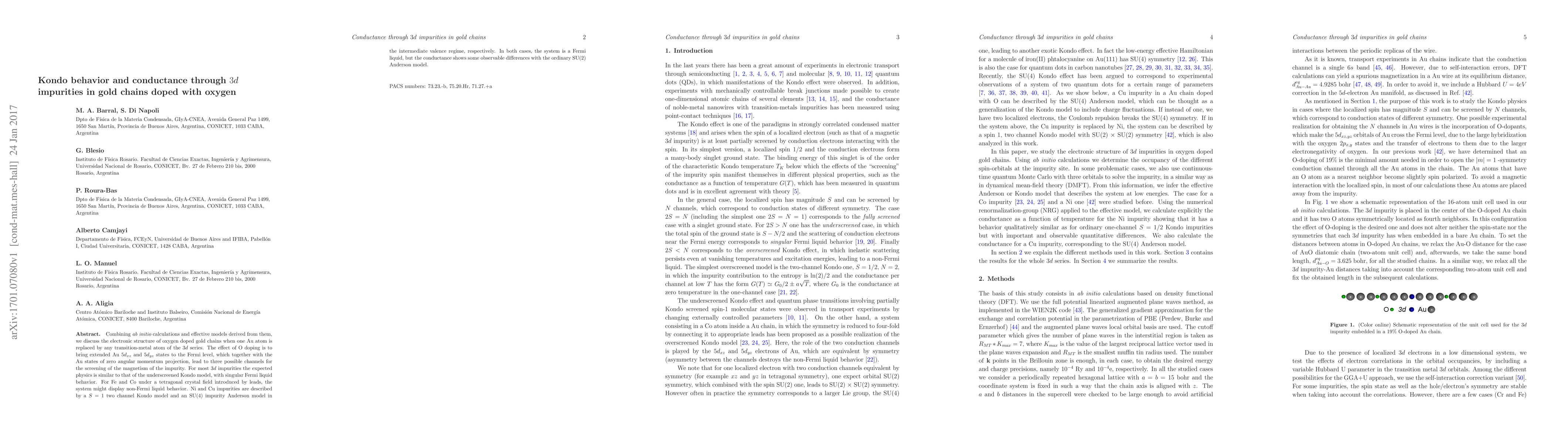 Combining ab initio calculations and effective models derived from them, we discuss the electronic structure of oxygen doped gold chains when one Au atom is replaced by any transition-metal atom of the $3d$ series. The effect of O doping is to bring extended Au $5d_{xz}$ and $5d_{yz}$ states to the Fermi level, which together with the Au states of zero angular momentum projection, lead to three possible channels for the screening of the magnetism of the impurity. For most 3d impurities the expected physics is similar to that of the underscreened Kondo model, with singular Fermi liquid behavior. For Fe and Co under a tetragonal crystal field introduced by leads, the system might display a non-Fermi liquid behavior. Ni and Cu impurities are described by a $S = 1$ two channel Kondo model and an SU(4) impurity Anderson model in the intermediate valence regime, respectively. In both cases, the system is a Fermi liquid, but the conductance shows some observable differences with the ordinary SU(2) Anderson model.