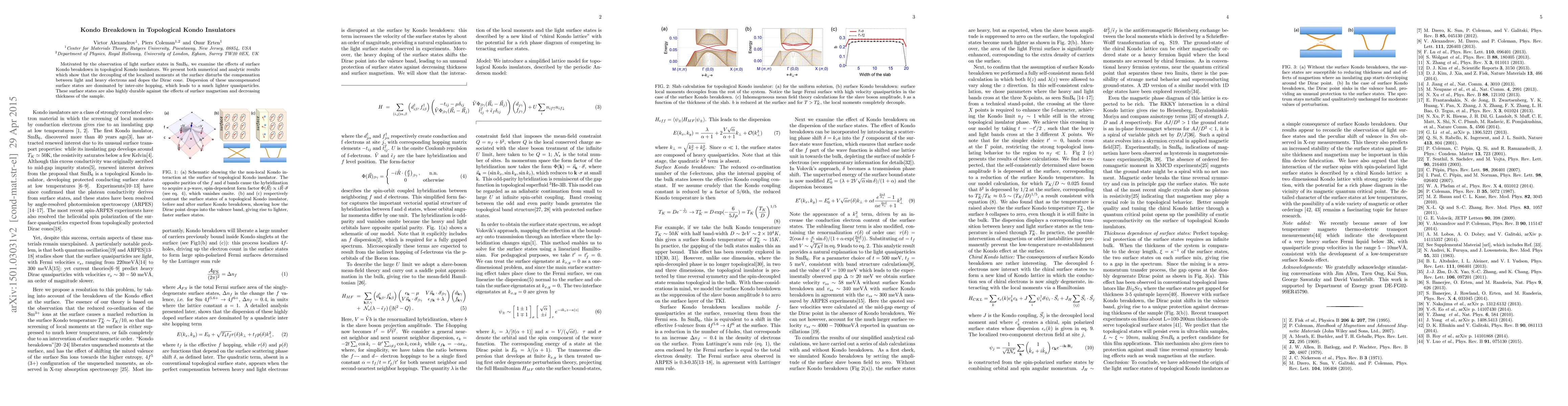 The paper presents a detailed analysis of surface Kondo breakdown in topological Kondo insulators, incorporating Volovik's method for surface state calculations and providing both numerical and analytic results.
