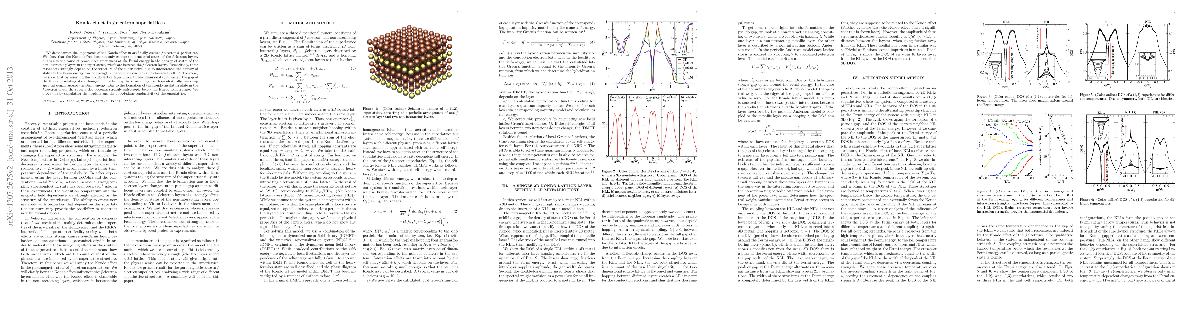 This paper investigates the Kondo effect in f-electron superlattices, demonstrating that it induces significant changes in the density of states and creates pronounced resonances at the Fermi energy in non-interacting layers. The study also reveals that the superlattice's structure can either enhance or suppress these resonances due to interference effects.