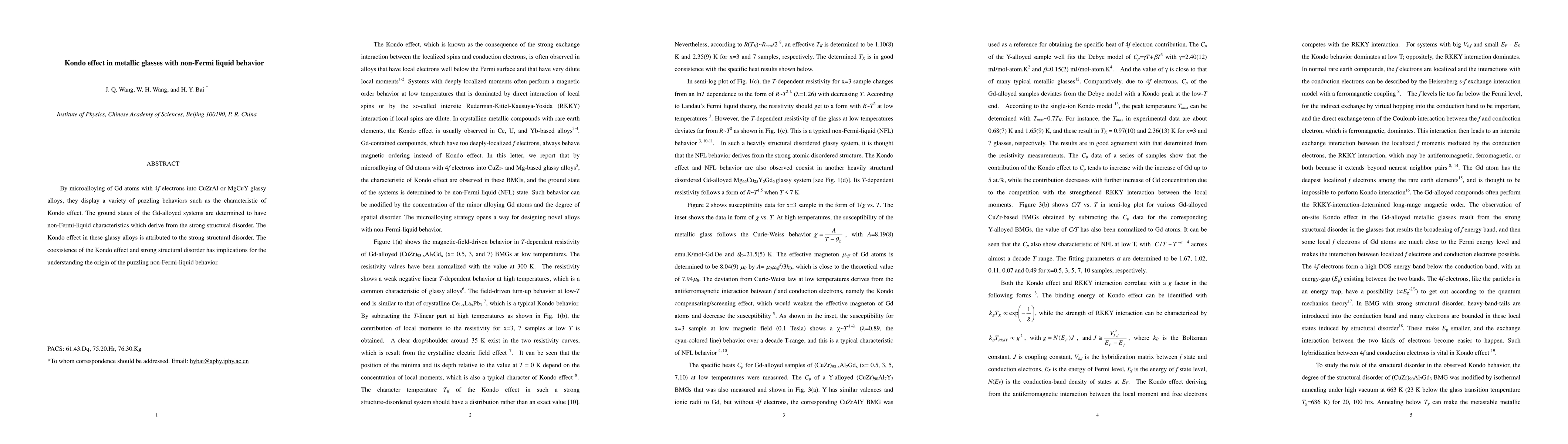 The paper presents a detailed study of the Kondo effect in Gd-alloyed metallic glasses with non-Fermi liquid behavior, attributing the observed phenomena to strong structural disorder and its impact on the Kondo effect and RKKY interaction.