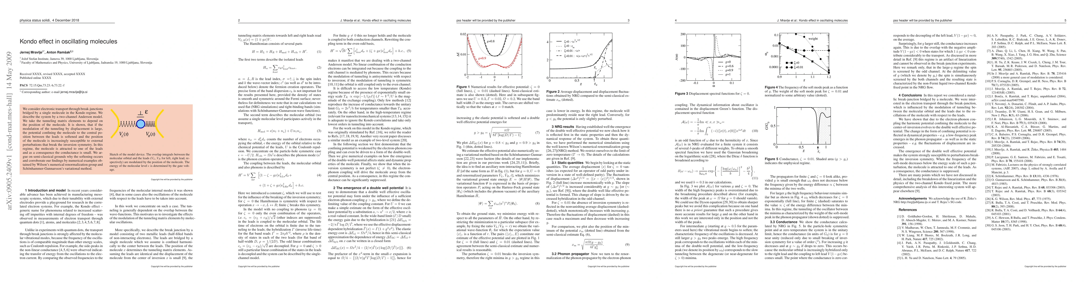 This paper explores electronic transport through oscillating molecules in Kondo regime break-junctions using a two-channel Anderson model. It demonstrates that large tunneling modulation by molecular displacement softens the confining potential, leading to conductance suppression due to the molecule's attraction to the leads and breaking of inversion symmetry, verified by numerical methods.