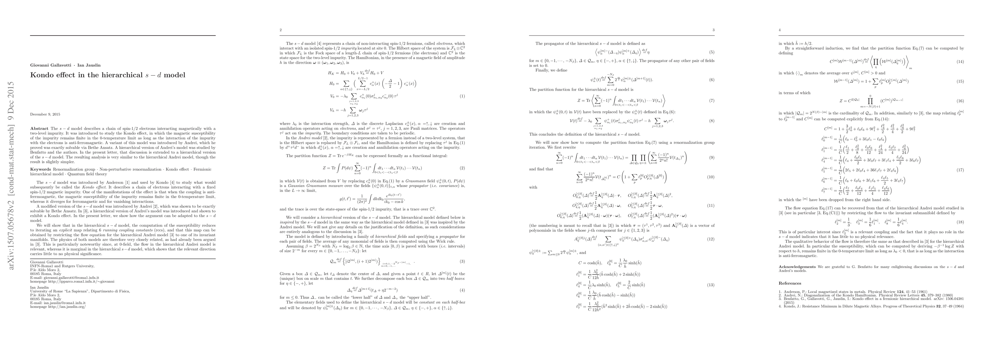 The s-d model describes a chain of spin-1/2 electrons interacting magnetically with a two-level impurity. It was introduced to study the Kondo effect, in which the magnetic susceptibility of the impurity remains finite in the 0-temperature limit as long as the interaction of the impurity with the electrons is anti-ferromagnetic. A variant of this model was introduced by Andrei, which he proved was exactly solvable via Bethe Ansatz. A hierarchical version of Andrei's model was studied by Benfatto and the authors. In the present letter, that discussion is extended to a hierarchical version of the s-d model. The resulting analysis is very similar to the hierarchical Andrei model, though the result is slightly simpler.