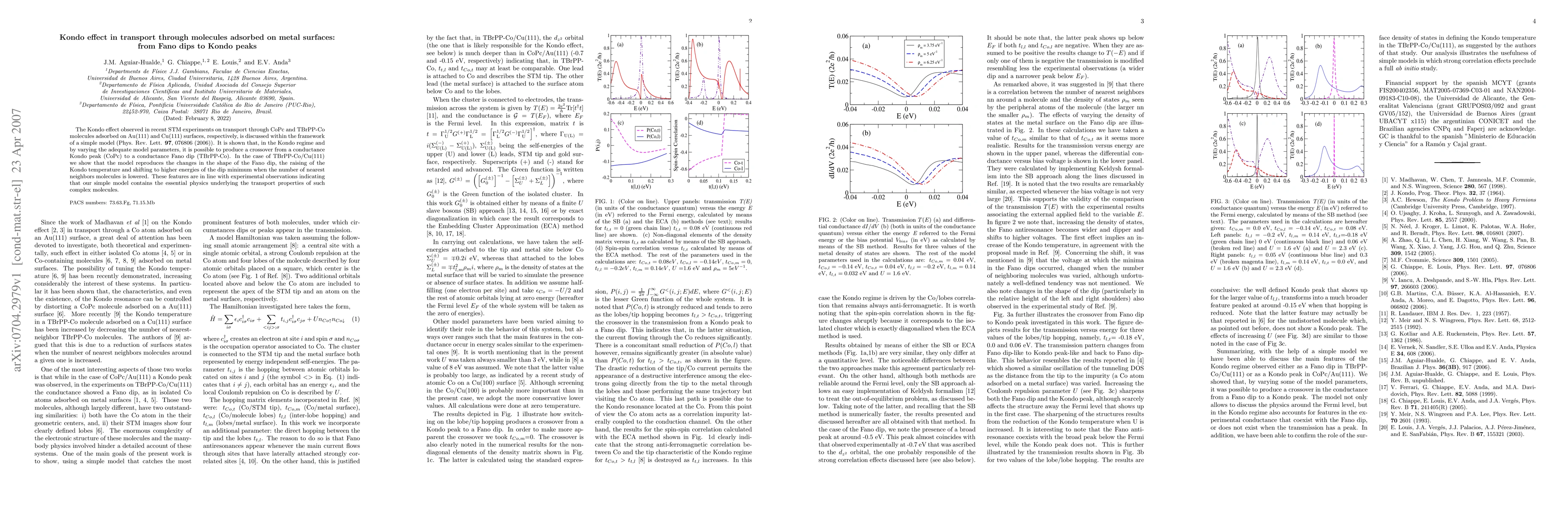 The Kondo effect observed in recent STM experiments on transport through CoPc and TBrPP-Co molecules adsorbed on Au(111) and Cu(111) surfaces, respectively, is discussed within the framework of a simple model (Phys. Rev. Lett. {\bf 97}, 076806 (2006)). It is shown that, in the Kondo regime and by varying the adequate model parameters, it is possible to produce a crossover from a conductance Kondo peak (CoPc) to a conductance Fano dip (TBrPP-Co). In the case of TBrPP-Co/Cu(111) we show that the model reproduces the changes in the shape of the Fano dip, the raising of the Kondo temperature and shifting to higher energies of the dip minimum when the number of nearest neighbors molecules is lowered. These features are in line with experimental observations indicating that our simple model contains the essential physics underlying the transport properties of such complex molecules.