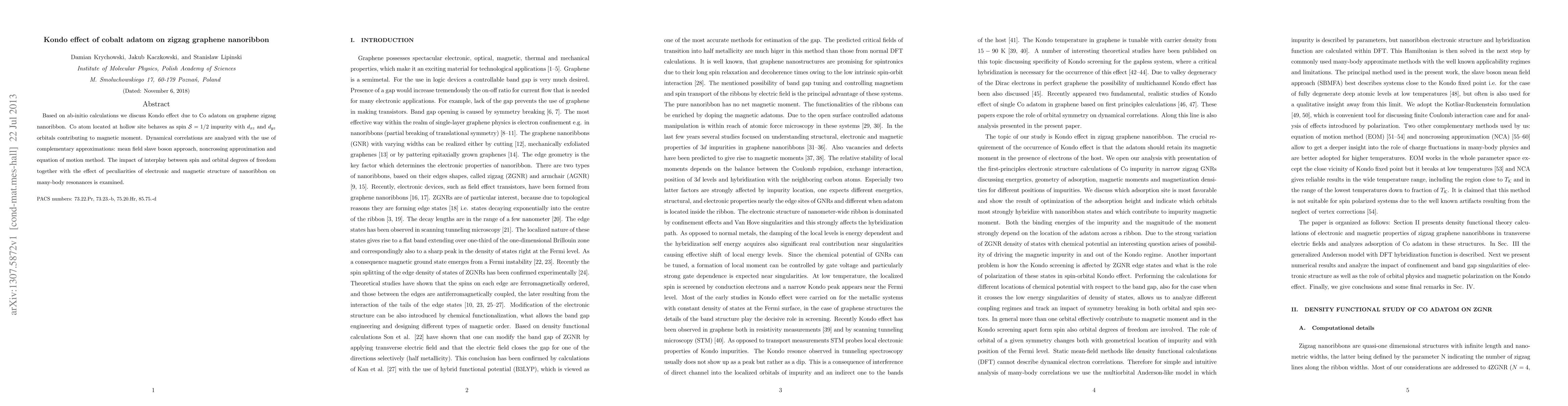 This study uses ab-initio calculations to explore the Kondo effect in a zigzag graphene nanoribbon with a cobalt adatom at a hollow site, finding that it behaves as a spin S=1/2 impurity. Various approximations are employed to analyze the impact of spin-orbital interactions and the nanoribbon's electronic structure on many-body resonances.