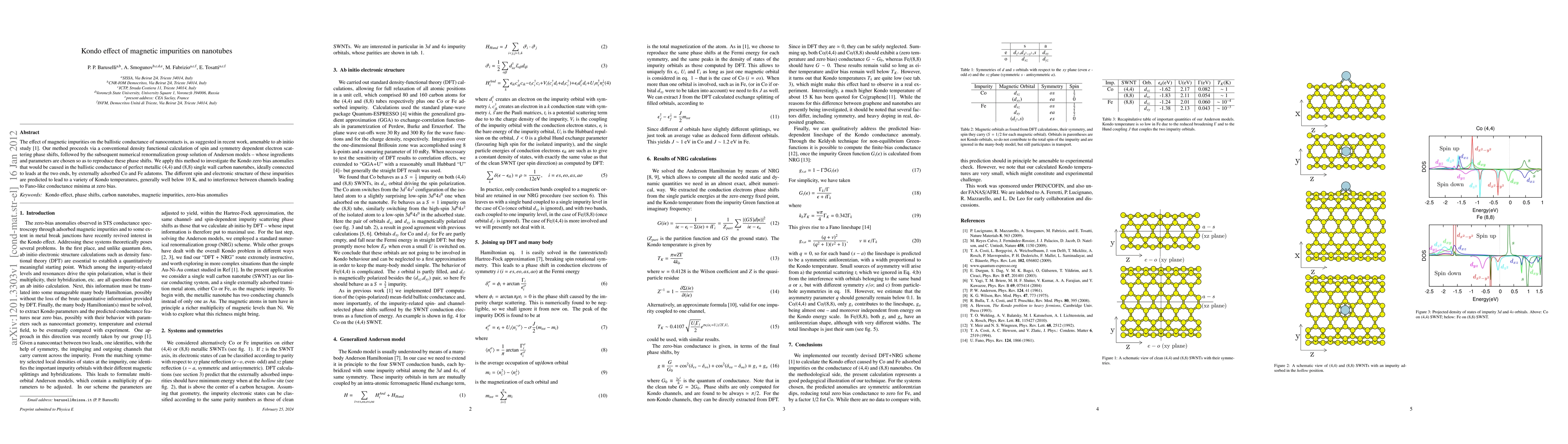 The effect of magnetic impurities on the ballistic conductance of nanocontacts is, as suggested in recent work, amenable to ab initio study \cite{naturemat}. Our method proceeds via a conventional density functional calculation of spin and symmetry dependent electron scattering phase shifts, followed by the subsequent numerical renormalization group solution of Anderson models -- whose ingredients and parameters are chosen so as to reproduce these phase shifts. We apply this method to investigate the Kondo zero bias anomalies that would be caused in the ballistic conductance of perfect metallic (4,4) and (8,8) single wall carbon nanotubes, ideally connected to leads at the two ends, by externally adsorbed Co and Fe adatoms. The different spin and electronic structure of these impurities are predicted to lead to a variety of Kondo temperatures, generally well below 10 K, and to interference between channels leading to Fano-like conductance minima at zero bias.