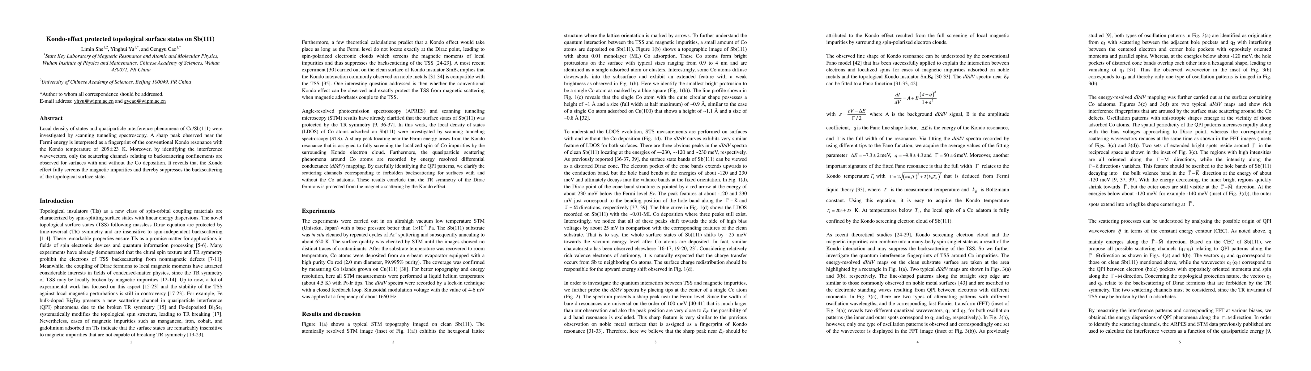 The Kondo effect in Co/Sb(111) is identified via scanning tunneling spectroscopy, revealing a sharp peak near the Fermi energy indicative of conventional Kondo resonance. The study finds that the Kondo effect suppresses backscattering, protecting topological surface states from magnetic impurity scattering.