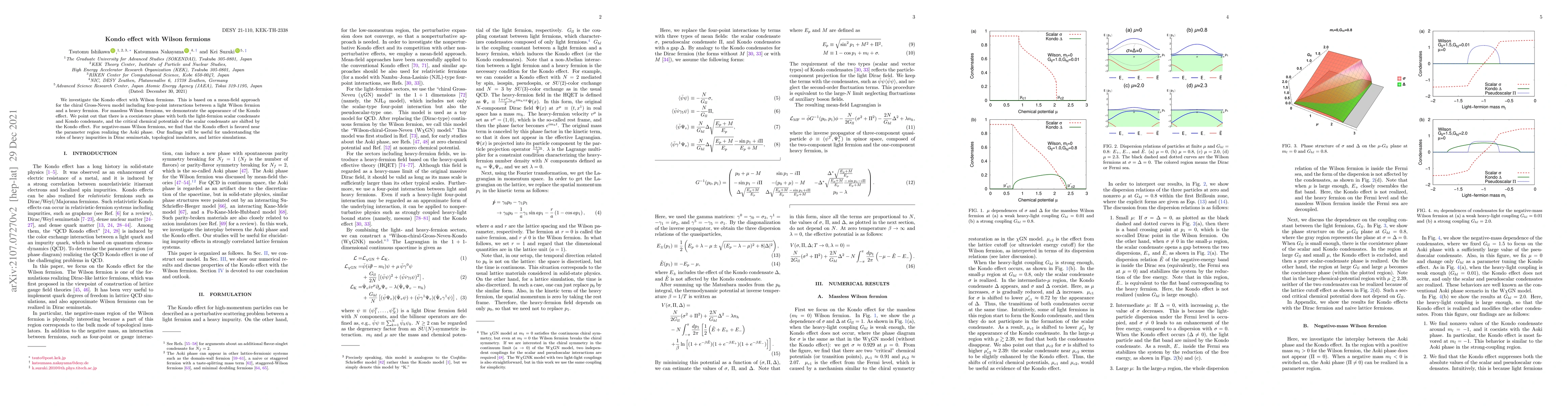 This paper explores the Kondo effect using Wilson fermions within a mean-field approach for the chiral Gross-Neveu model, revealing a coexistence phase with both light-fermion and Kondo condensates. The study also finds that the Kondo effect is prominent in the Aoki phase for negative-mass Wilson fermions, providing insights into heavy impurity roles in various materials.