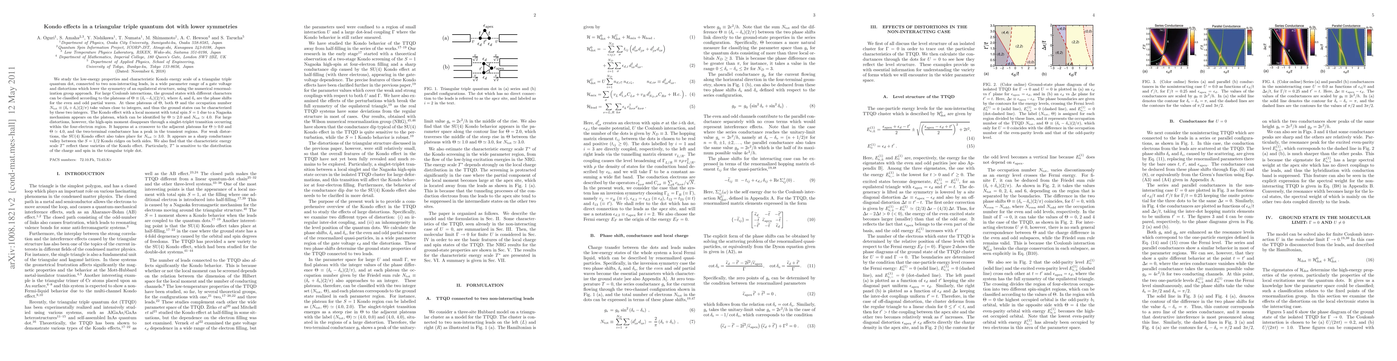This paper investigates Kondo effects in a triangular triple quantum dot with lowered symmetry, using the Wilson numerical renormalization group. It explores how variations in electron-filling and symmetry-breaking distortions influence the Kondo energy scale and behavior across different regions of the parameter space.
