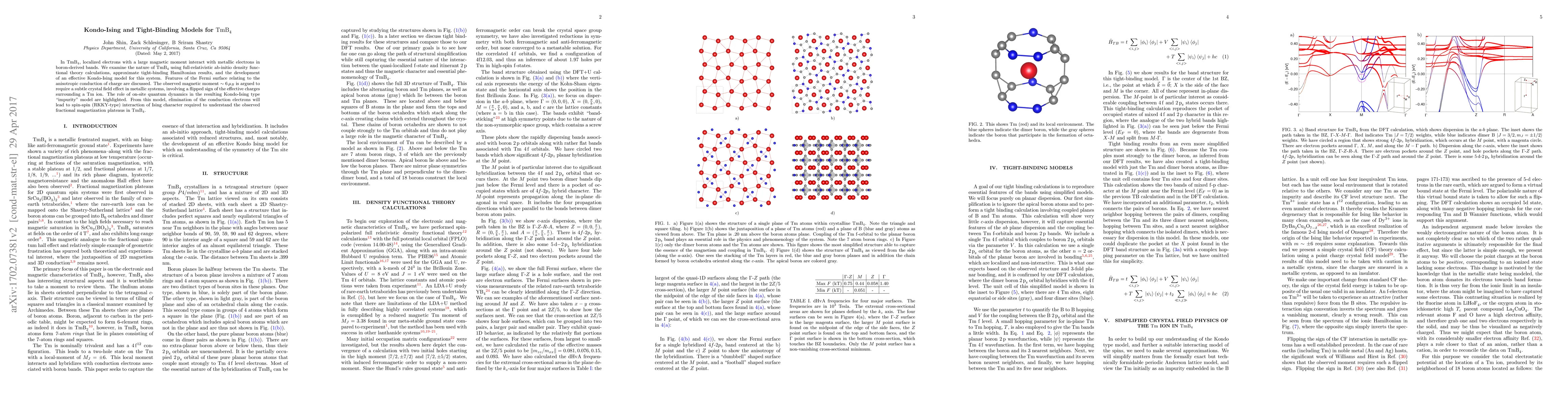 This paper investigates $TmB_4$ using ab-initio calculations and tight-binding models, developing a Kondo-Ising model to explain its magnetic properties, including fractional magnetization plateaus, and the role of crystal field effects in its anisotropic conduction.