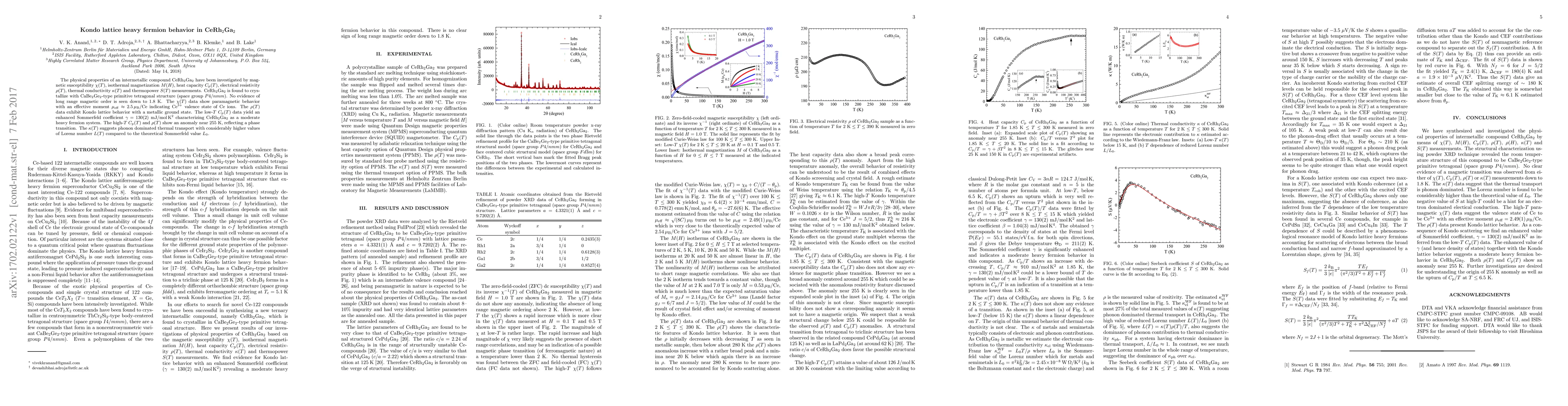 Researchers investigated CeRh2Ga2, finding it exhibits Kondo lattice behavior with a metallic ground state and moderate heavy fermion properties, including an enhanced Sommerfeld coefficient and phonon-dominated thermal transport.