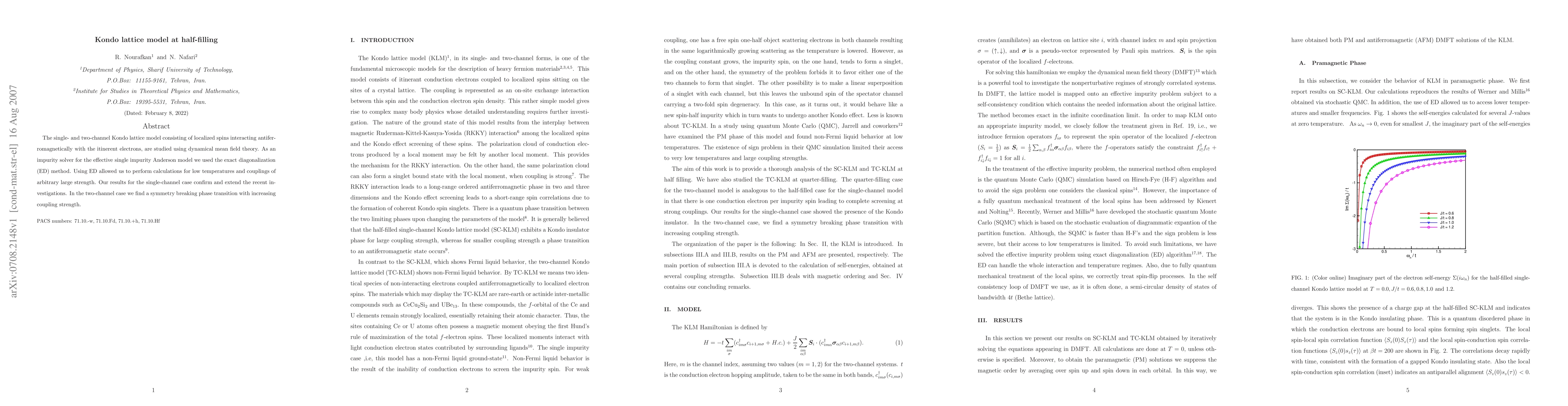 The single- and two-channel Kondo lattice model consisting of localized spins interacting antiferromagnetically with the itinerent electrons, are studied using dynamical mean field theory. As an impurity solver for the effective single impurity Anderson model we used the exact diagonalization (ED) method. Using ED allowed us to perform calculations for low temperatures and couplings of arbitrary large strength. Our results for the single-channel case confirm and extend the recent investigations. In the two-channel case we find a symmetry breaking phase transition with increasing coupling strength.